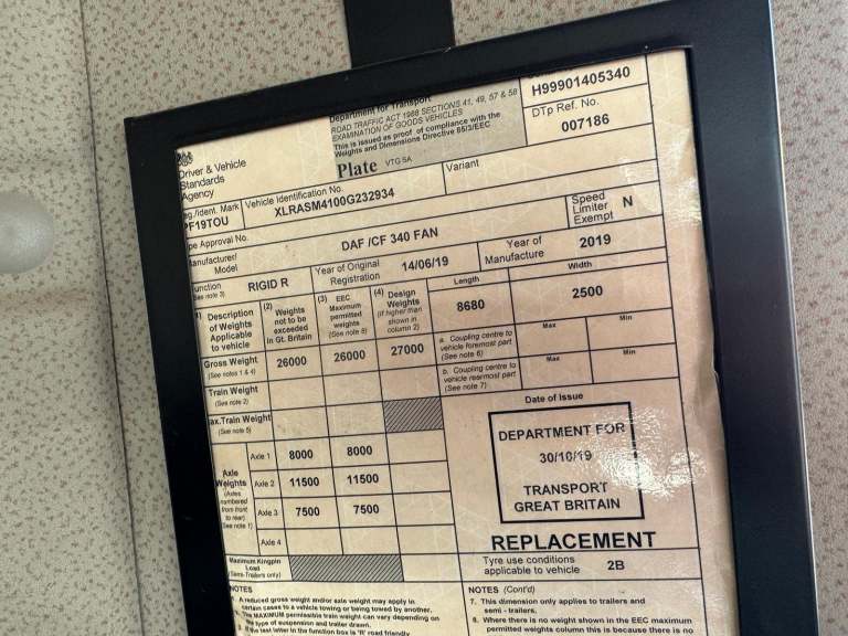 2019 DAF CF 340 6X2 20,000 LITRE FUEL TANKER, EURO 6, REAR LIFT AND STEER, EMCO WHEATON EQUIPMENT AND METER, PRINTER AND HOSE REEL, BULK UNLOAD, ADR SPEC, MANUAL GEARBOX, AIR CON, SAT NAV, ALLOY WHEELS, 150,000 MILE, COMES WITH NEW TANK TEST, READY TO WORK.