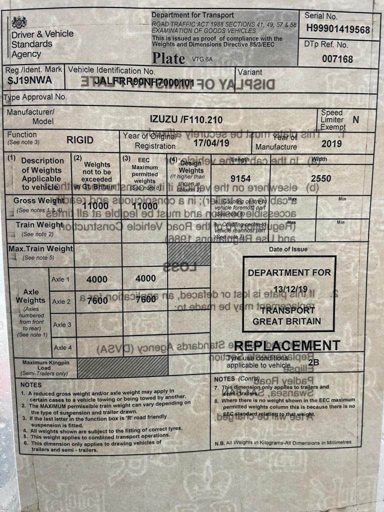 2019 19 REG ISUZU FORWARD F110.210 11 TON EURO 6