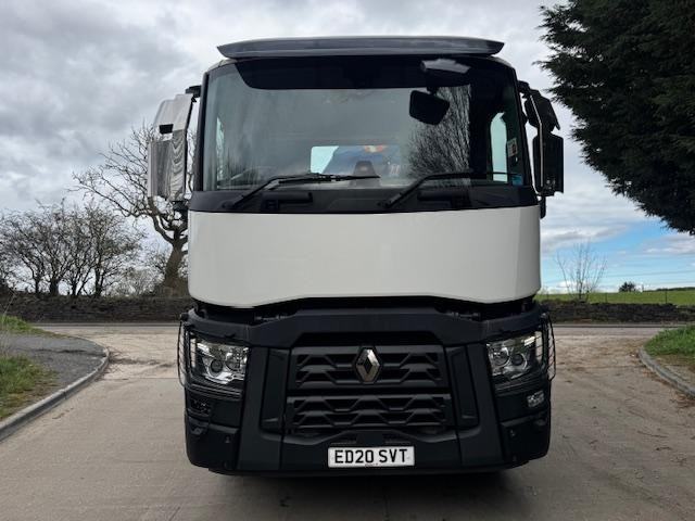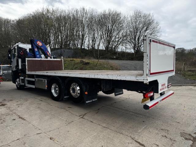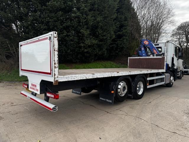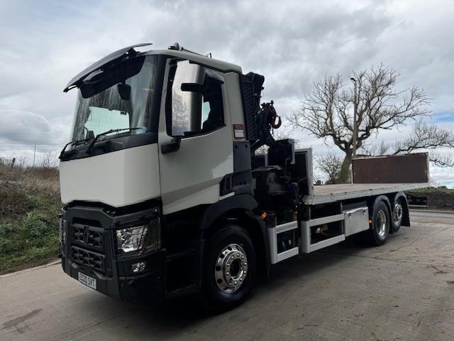 2020 20 RENAULT C380 EURO 6 6x2 rear lift/steer, 24ft flat bed, PM Serie 15.5 double extension remote control crane, tool box, up right exhaust, beacons, air horns, sun visor, alloy wheels, camera system, audible indication, Auto, cruise, hill assist, diff lock, anti collision, off road mode, central locking, heated air seat, air con climate control, electric windows/mirrors, phone, sun roof, 192,000kms, £49,950 + VAT (ED20 SVT)