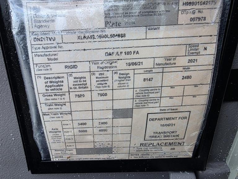 2021 DAF LF 180 7.5 Ton with 20ft GRP box, manual gearbox, colum tail lift with safety rails, 138,018 kms, 3 seats, MOT 31/07/2026