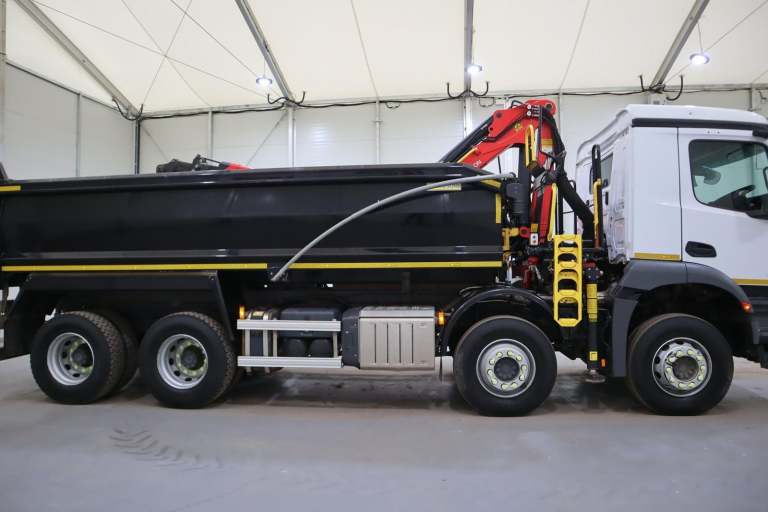 2022 (72 PLATE) MERCEDES BENZ AROCS 3240 GRAB 8X4 EURO 6 TIPPER, DAY-CAB, STEEL BODY, PALFINGER EPSILON M125L CLASSIC CRANE W/ CLAM SHELL GRAB, UNDER FLOOR TIP GEAR, ROOF-MOUNTED BEACONS, KEYLESS IGNITION, LEAF SPRING SUSPENSION SYSTEM, HYDRAULIC STABILIZING LEGS, EXTERIOR SUN VISOR, MOTORIZED LOAD SHEET, A/C CLIMATE CONTROL, RADIO/STEREO, DIGITAL TACHOGRAPH, 2-PEDAL, PRICE IS POA