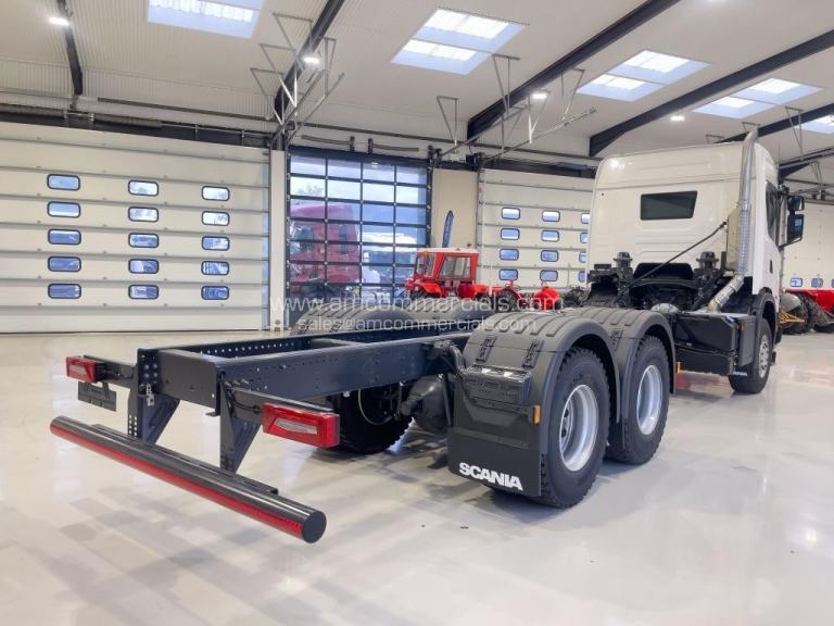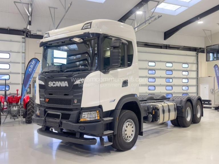 Brand New Scania 460G Super XT. Chassis Cab. 6X4 Double Drive, Dual PTO Prep, Heavy Duty Flitch Plated Chassis, Integrated Scania Retarder, Mirror Guards, Steel Front XT Bumper, Vertical Exhaust, Top Lights, Camera Kit, 615L Fuel, 5.9M WB To Rear Drive Axle, 5.2M Between Both Drive Axles, 4.56M To First Drive Axle. Delivery Miles Only, Finance Available subject to status.