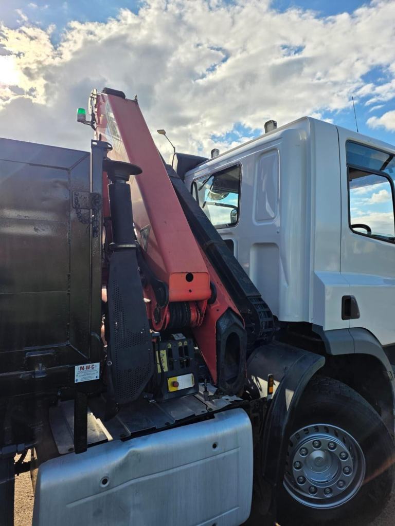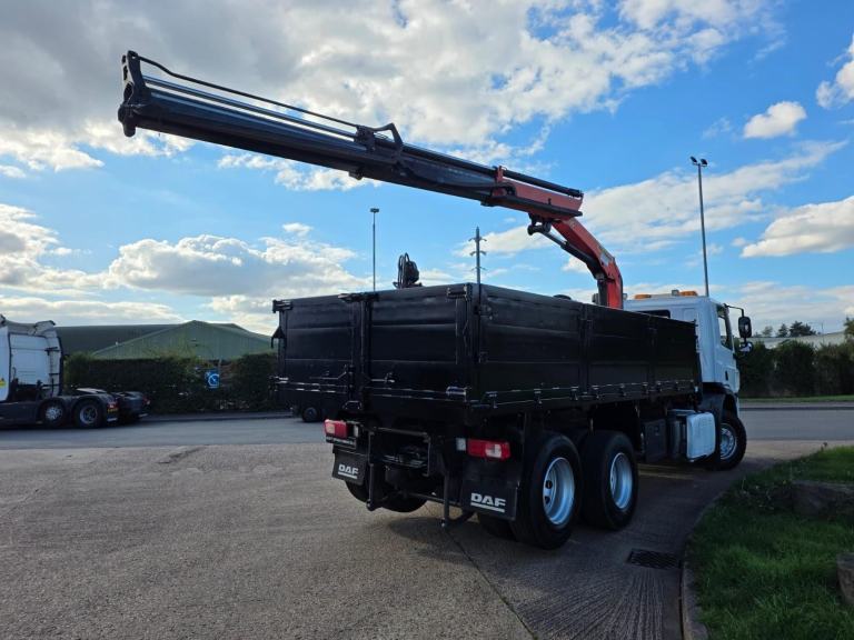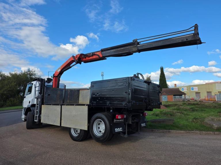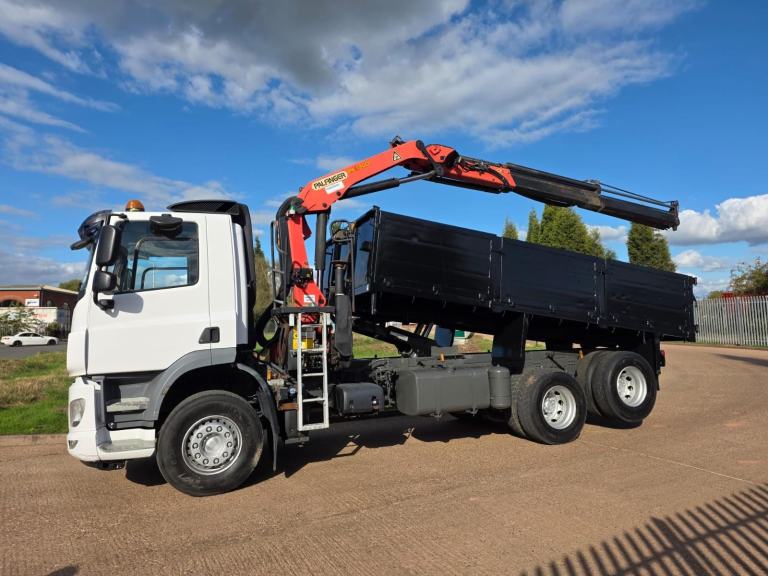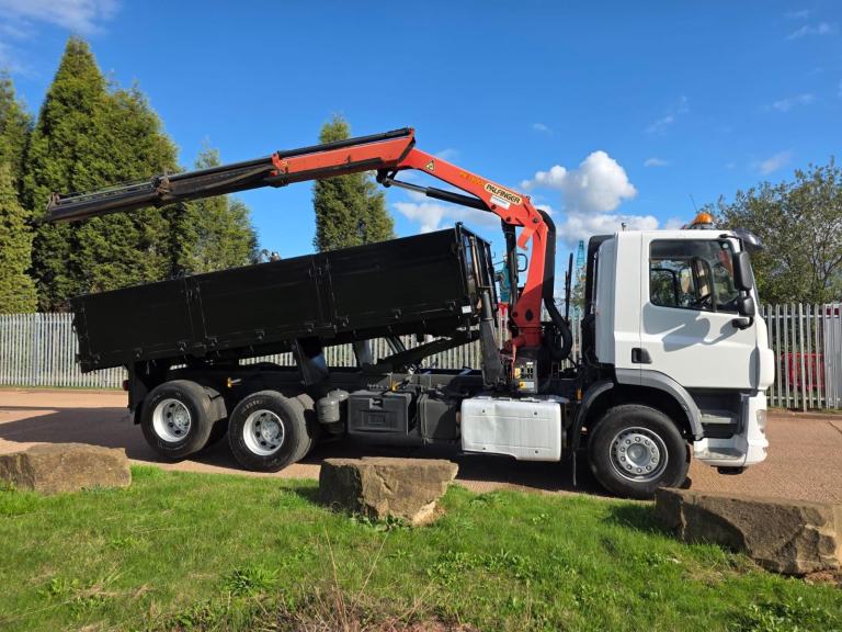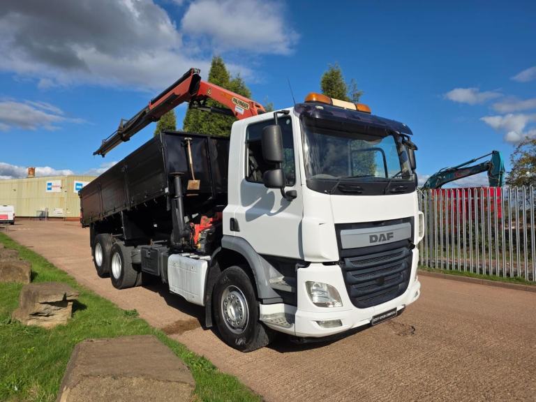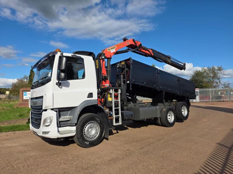 DAF CF 330 2014 (64) EURO 6, DAY CAB, 6X2 TIPPER GRAB, REAR LIFT AXLE, 5.7 MTR TRIPLE DROPSIDE STEEL BODY, ALI SIDES, BARN DOORS, PALFINGER PK 13001 REMOTE CONTROLLED CRANE, 2 EXTENSIONS, UNDERFLOOR HARSH TIPPING GEAR, REVERSING CAMERA, MANUAL GEARBOX, CRUISE CONTROL, TOOL BOX, SUN ROOF, SUN VISOR, BEACONS, AIR CON, STEERING WHEEL CONTROLS, CD, AIR SUSPENSION, 260,000 MILES.