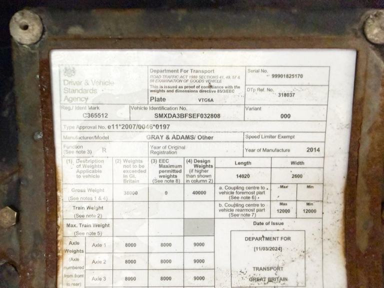 2014 Gray & Adams Mono-Temp Fridge Trailer, 4500MM Height, Tri Axle, Jost Landing Legs, Rear Barn Doors, Side Guards, BPW Drums, Raise/Lower Valve, 26,000 Hours.