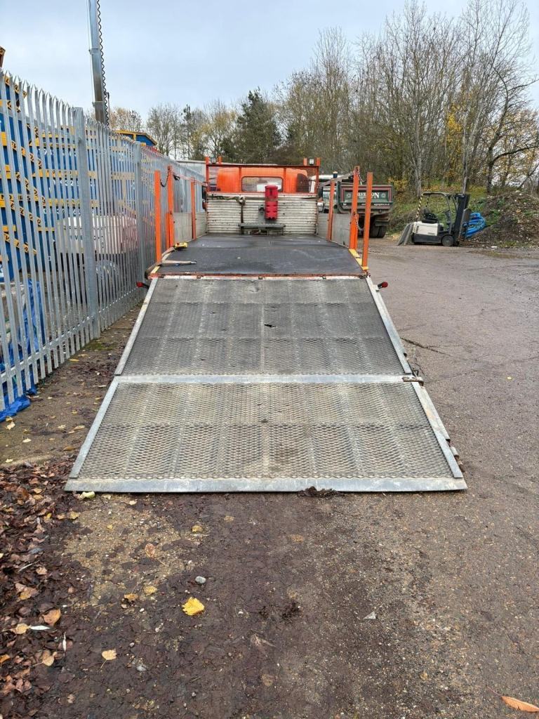 Direct one company owner from new Isuzu 190 auto beaver tail with hydraulic flip over ramp drop sides flashing beacon winch euro 6 ULEZ compliant