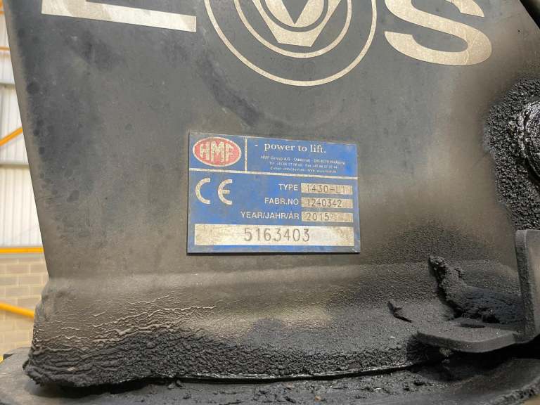Gearbox Driven HMF 1430 Rear Mounted Crane C/w Remote Controls, Hydraulic Stabiliser Legs And Rotating Brick Grab.
