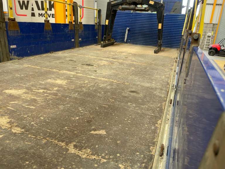 19Ft 6ins Flatbed Body C/w Wood Panel Flooring, Raised Headboard And Aluminium Dropsides.