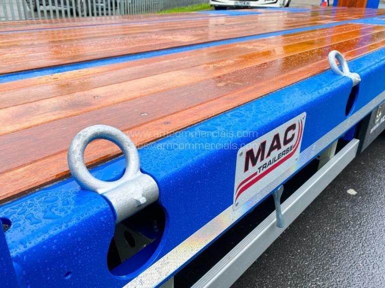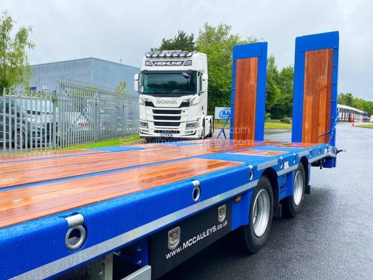 Key Spec: Tandem axle with BPW drums (SAF also available), 19,000kg UK gross weight, 1,000kg drawbar weight, 18,000kg bogie design weight, 1400mm axle spacing, 2.4m x 76cm hydraulic ramps, hardwood plank deck with chequer plate over axles, bed lengths starting at 18ft (22ft pictured), 2550mm bed width with 1000mm beavertail, IP100 crossmembers welded through the beam for superior strength, EBS and air-line braking via WABCO system, SAF swivel landing leg, optional D-rings, loading support legs and powder-coated tool boxes, and a custom hitch height to match your vehicle. Available in a range of colours and built to your spec, with additional options available on request.