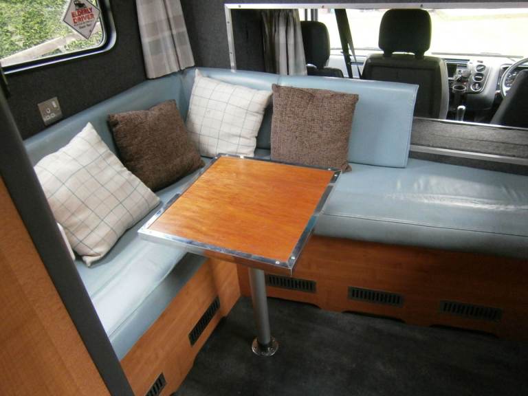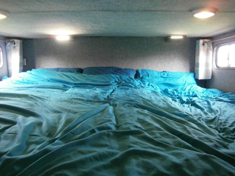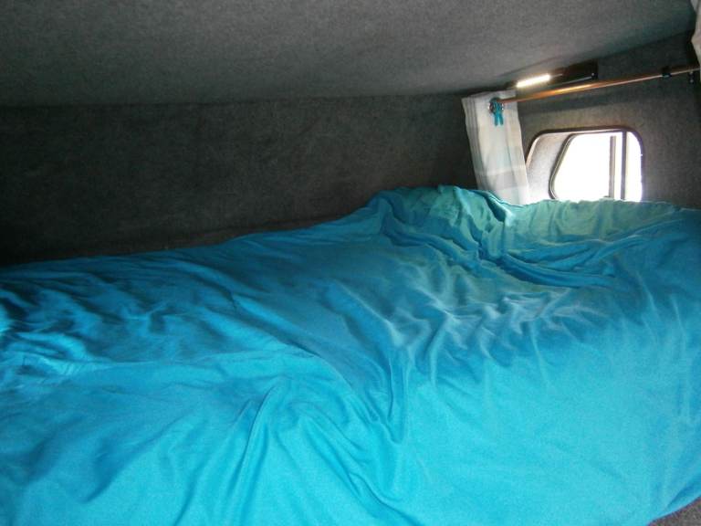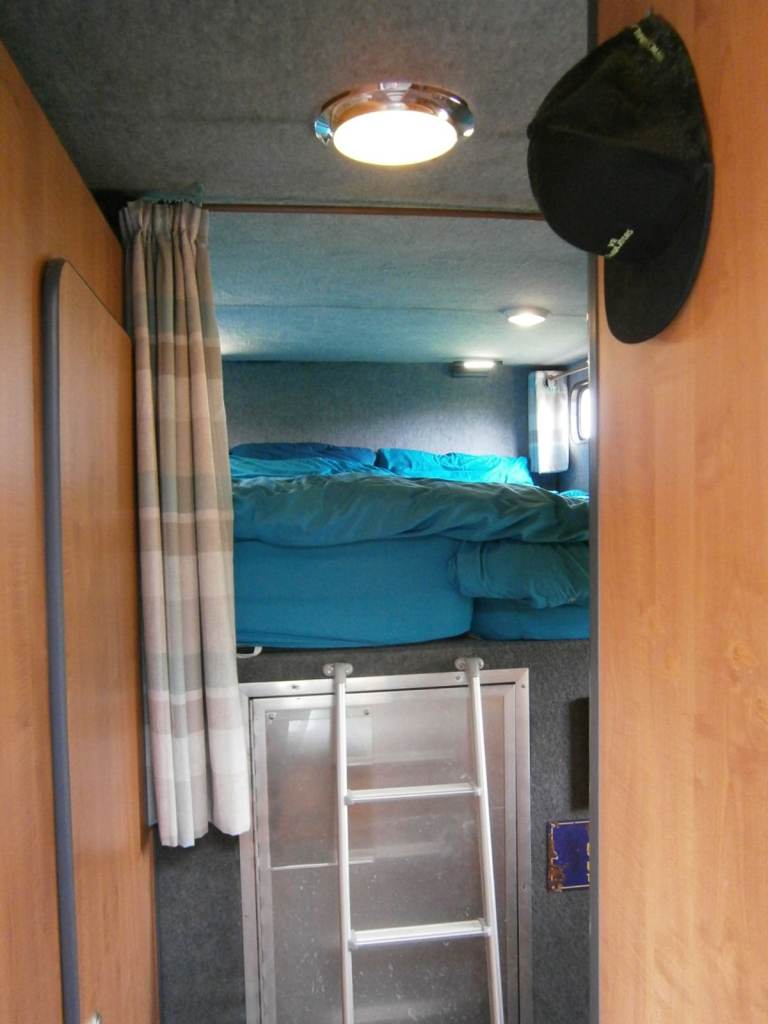 Sleeps 5 with two separate sleeping areas one in a pod over the cab (double mattress) and one over the garage at the back (one double and one single mattress).