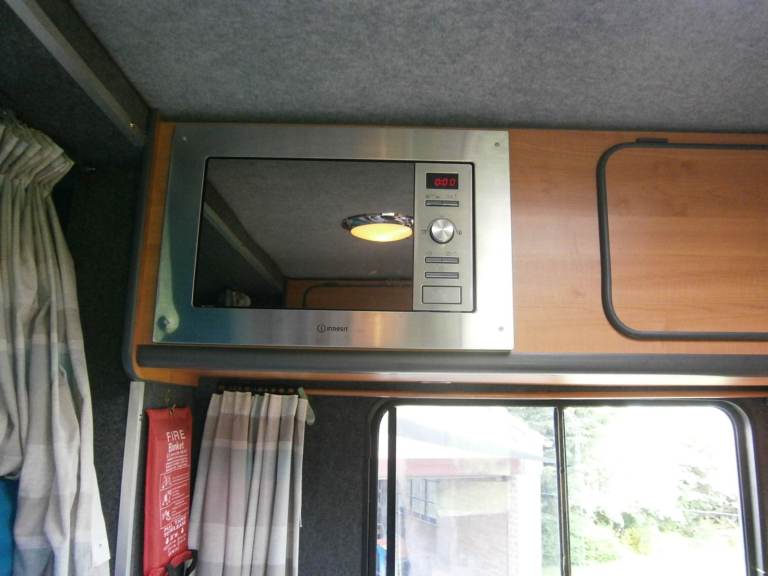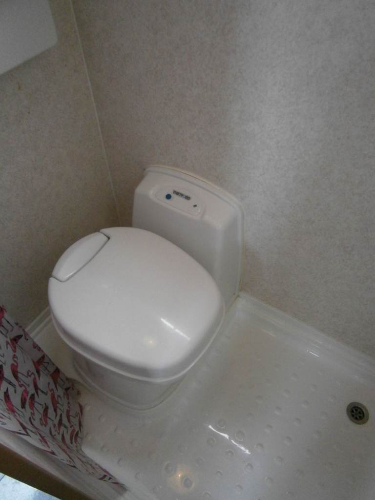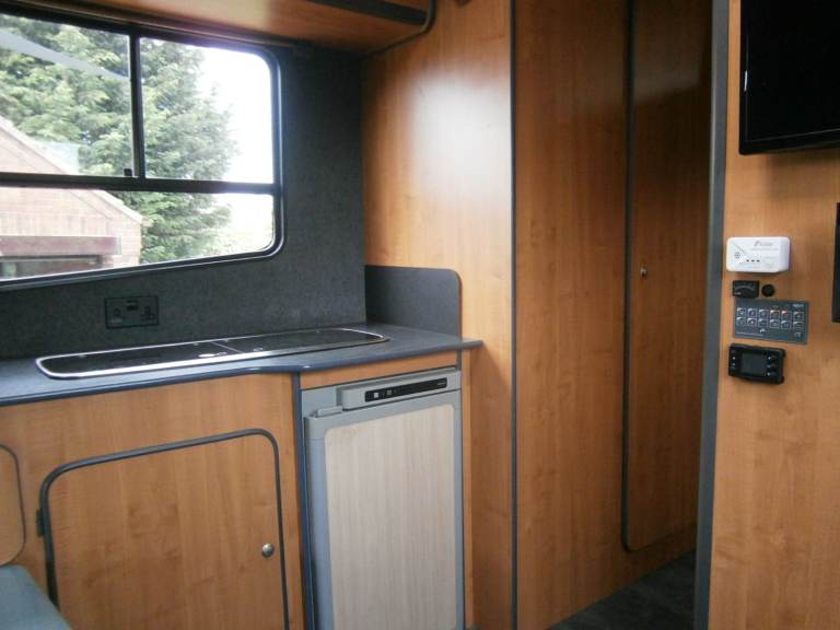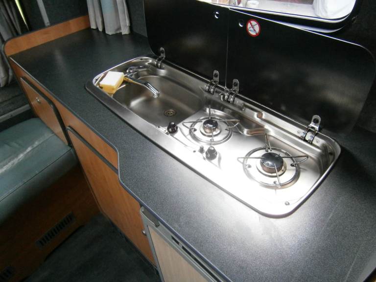 Thetford fridge, flushing Thetford toilet, two head shower, microwave, sink with hot and cold running water, two ring gas burner, 2 x TVs, and stereo.