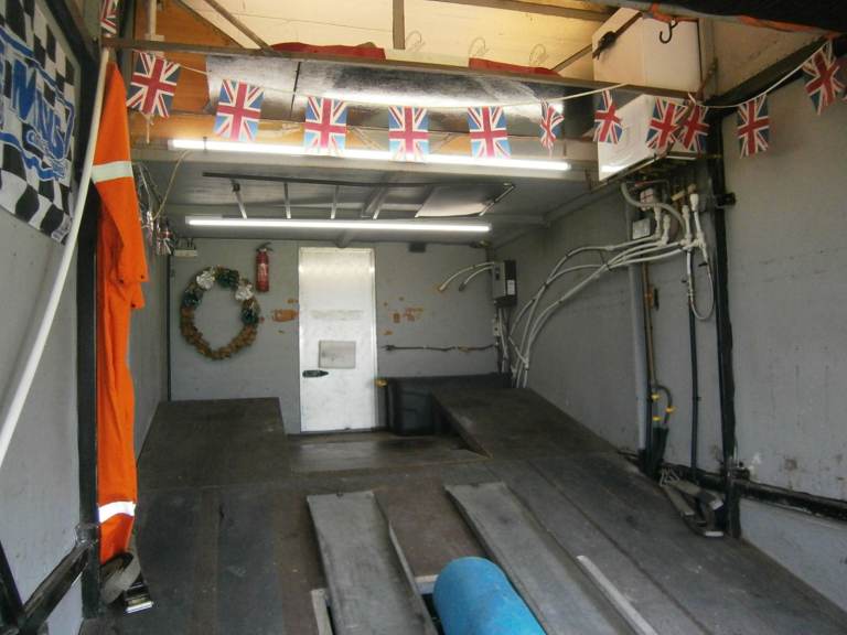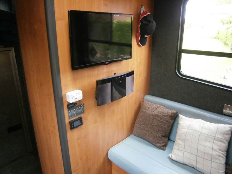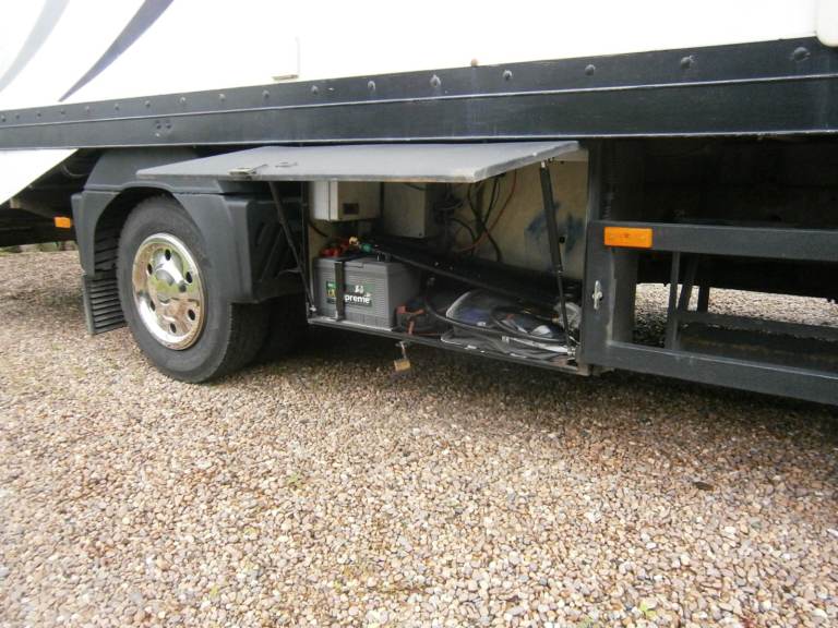 Living quarters supplied by 240v hook-up, external generator, or two 12v leisure batteries. Battery charger/inverter in garage area. Automatic selection/changeover of power feeds as required.