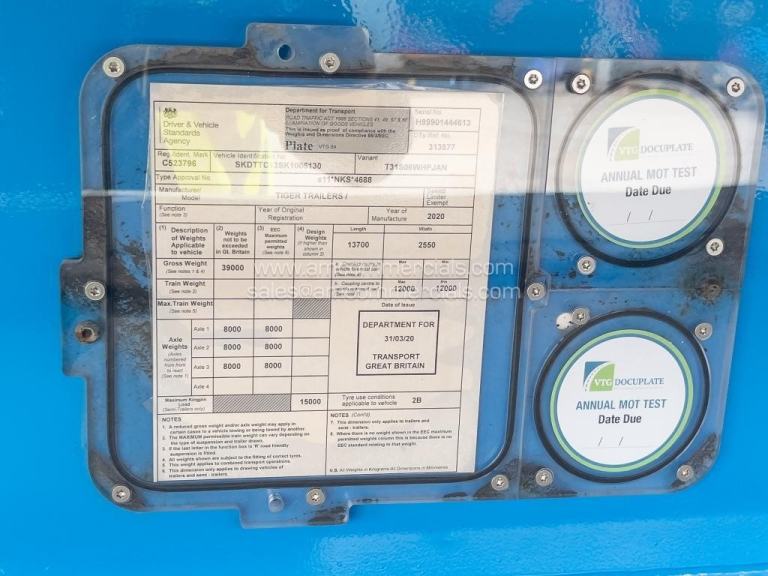2020 Tiger Curtainside Trailer, Tri Axle Jost Discs, Alcoa Alloys, Jost Landing Legs, Side Guards, Rear Barn Door, Wabco Braking & Raise/Lower Valve, Toolboxes, 2.4M Rear & Side Loading Height, Great condition, MOT 30th April 2027, Finance Available Subject to Status.