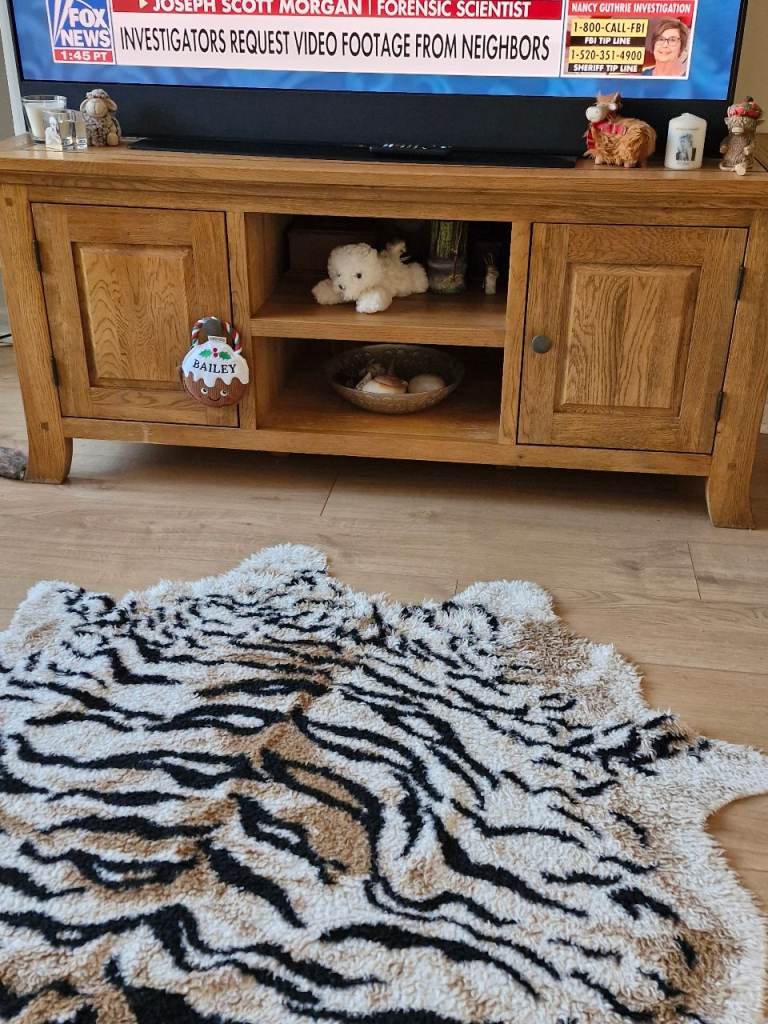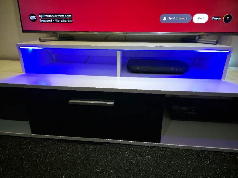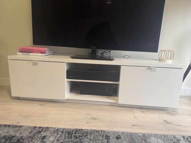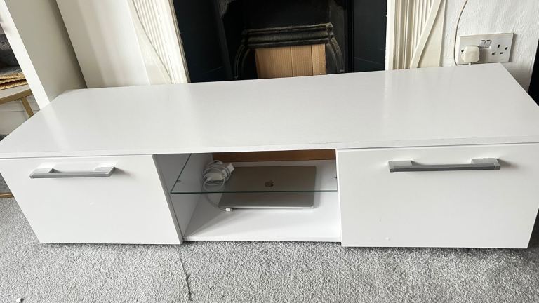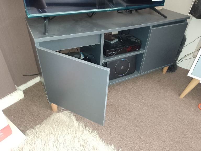 In good but used condition, there are some marks/scratches on the shelevs but generally covered up by the TV once in place. It is quite heavy.