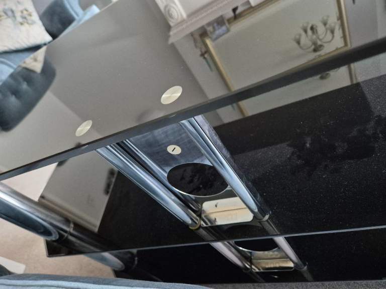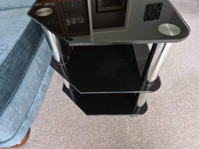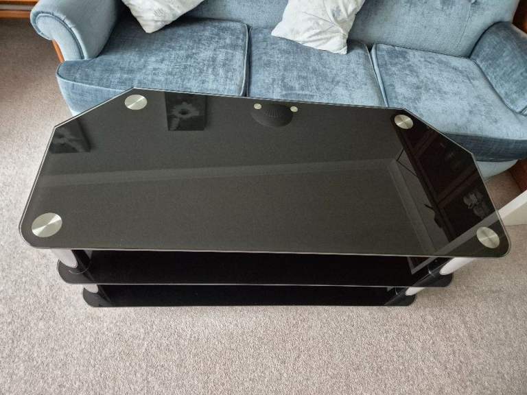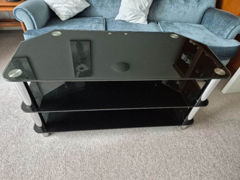 Black glass and chrome TV stand - 105cm wide x 45cm deep x 52.5cm tall