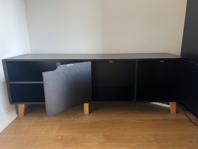 Modern black TV unit with wooden legs and built-in storage. Minimal design and in good condition.