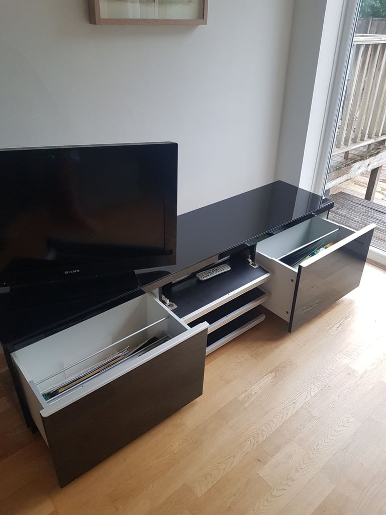Very good condition unit with 2 large drawers and central storage with fold down covers.