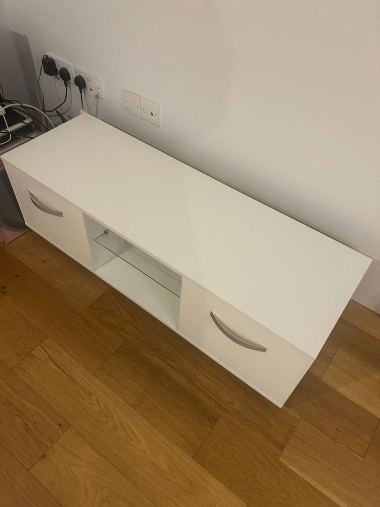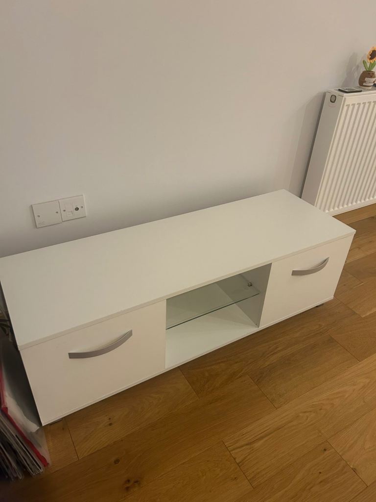 2 door LED TV Stand, with central glass shelf. Can withstand TV’s with up to 50 inches. We did not put on the LED lights on but do still have them if needed. Great condition.