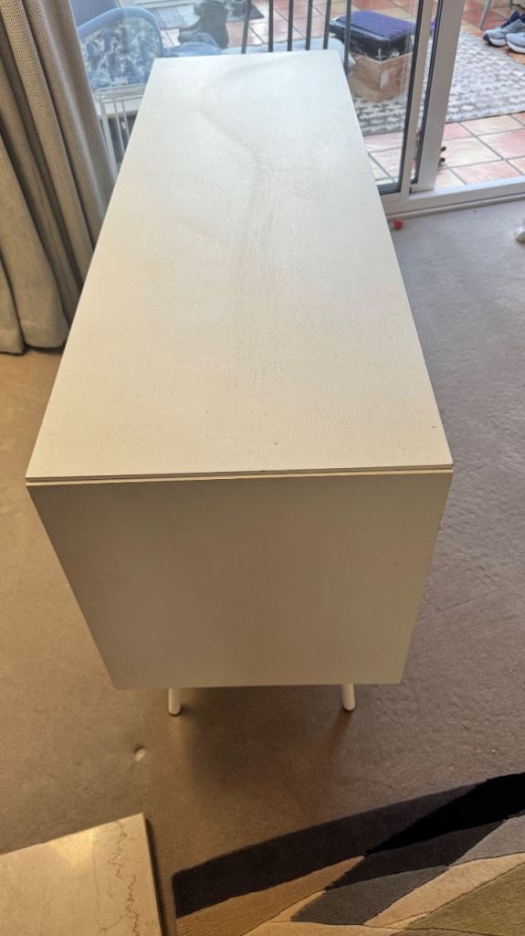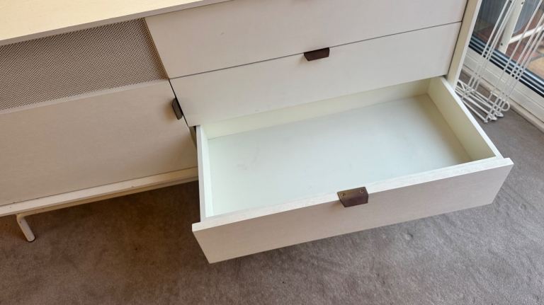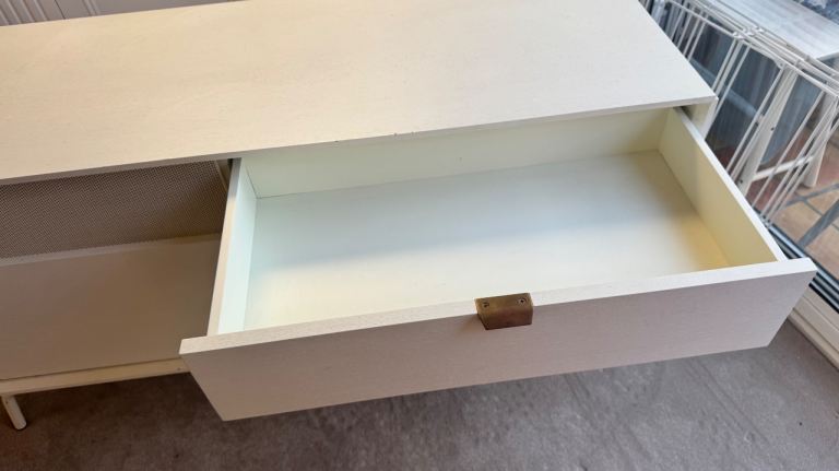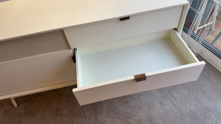 Blu Dot Dang 1 door / 3 drawer media unit. Powder-coated perforated steel door fronts allow use of remotes. Antique brass door and drawer pulls that patina over time. Powder-coated steel base with leveling feet. Buffers at shelves for soft-close doors. Cord management escapes. Adjustable interior shelves. Finished back. White painted oak veneer over wood case; perforated steel and legs match case. Excellent condition. Collect in person. Lovely cream chest of drawers or sideboard, perfect for a living room or bedroom.