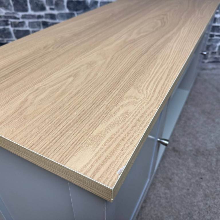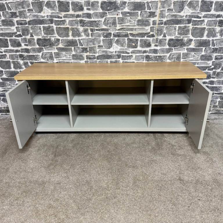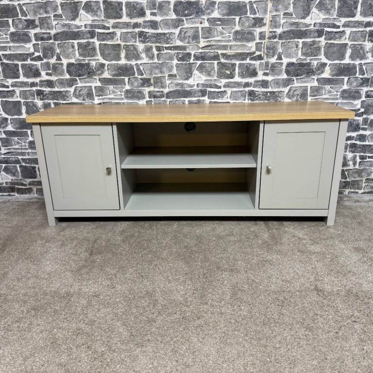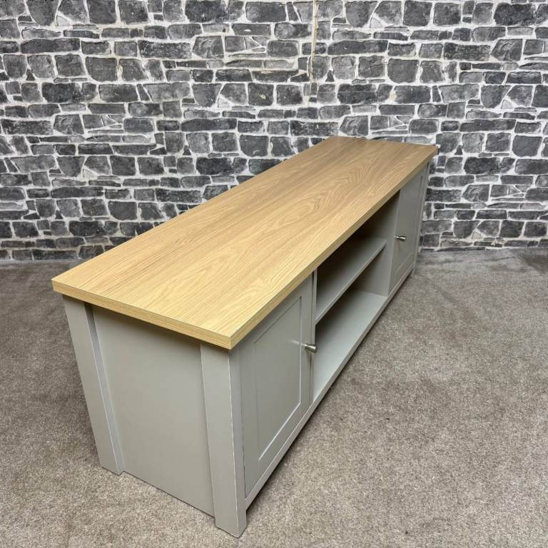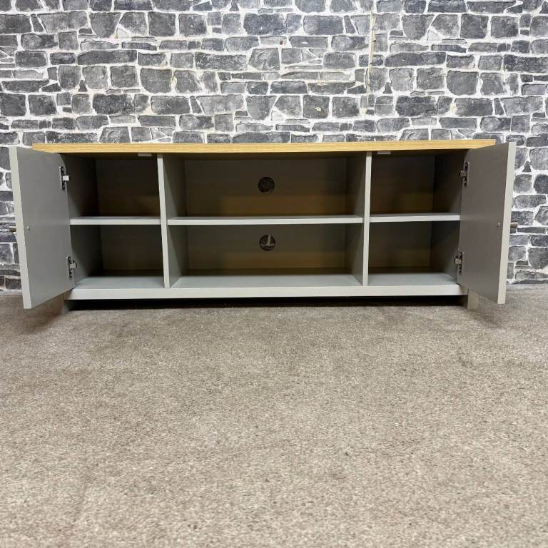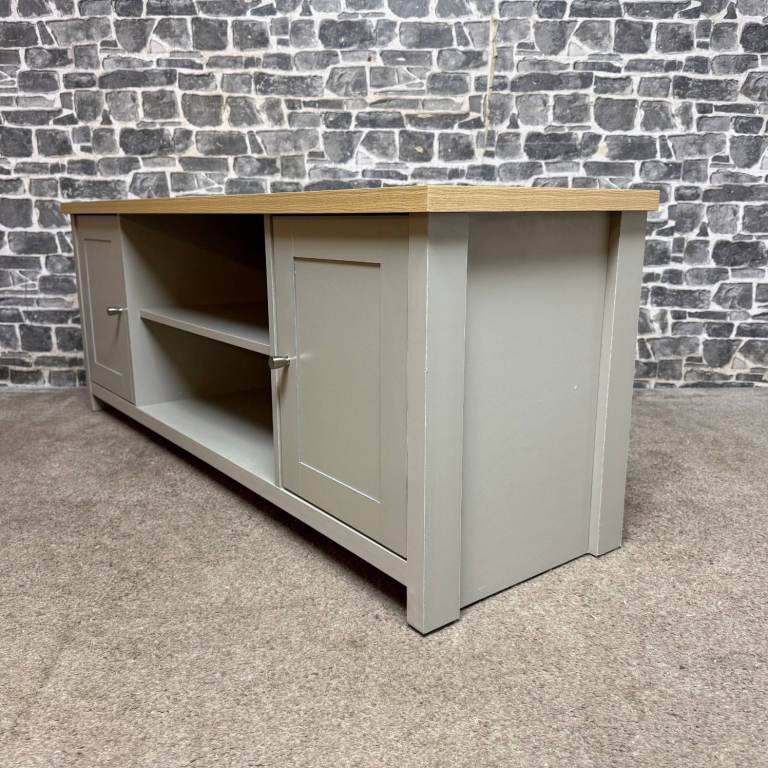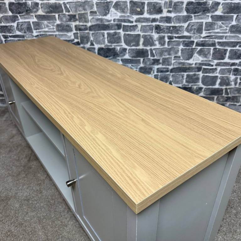 Stylish TV unit with a painted grey body and a contrasting oak-effect top. Features two side cupboards for concealed storage and an open central section with shelving and cable holes, ideal for media boxes and consoles. The unit is solid and sturdy and overall in good condition, with just a couple of small marks along the back edge that do not affect use or appearance from the front. Dimensions: L 130 x D 40 x H 50 cm