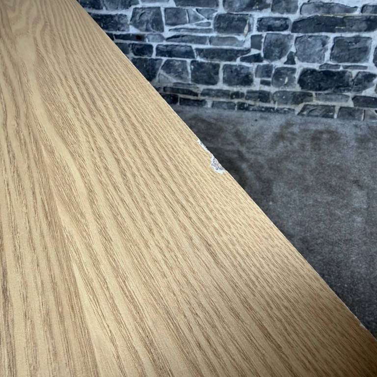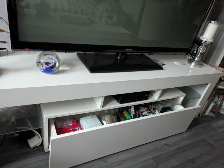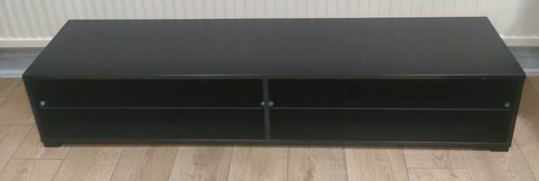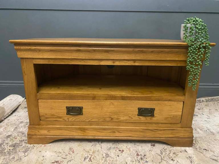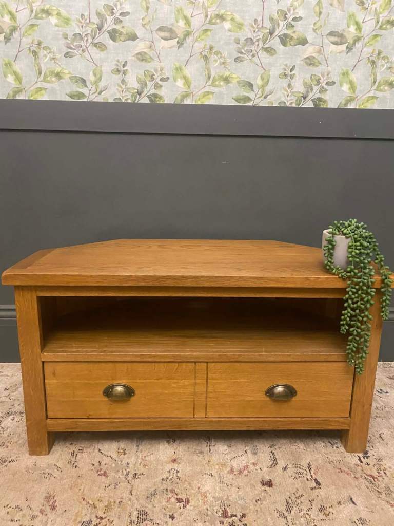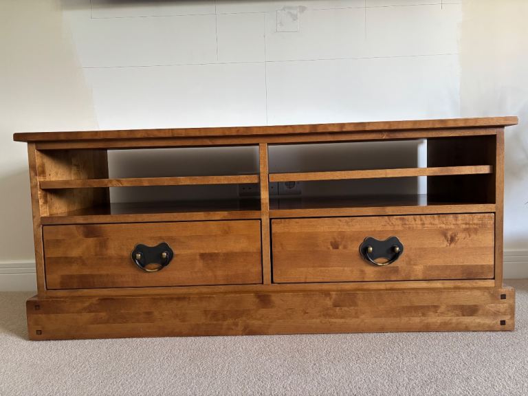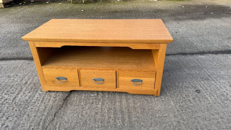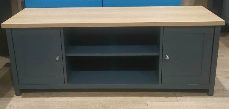 Stylish TV unit with a painted grey body and a contrasting oak-effect top. Features two side cupboards for concealed storage and an open central section with shelving and cable holes, ideal for media boxes and consoles. The unit is solid and sturdy and overall in good condition, with just a couple of small marks along the back edge that do not affect use or appearance from the front. Dimensions: L 130 x D 40 x H 50 cm