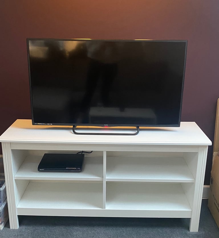 White IKEA TV unit with four open shelves. Great condition! Measures approx 120cm wide, 62cm high and 36cm deep.