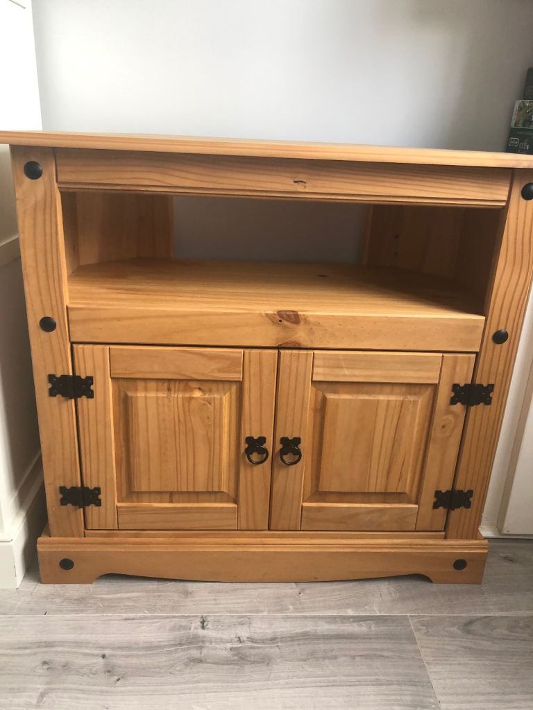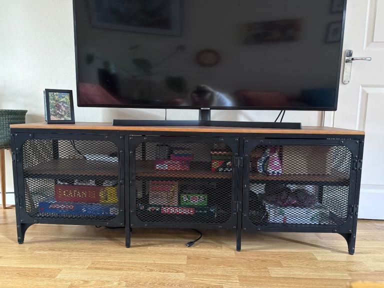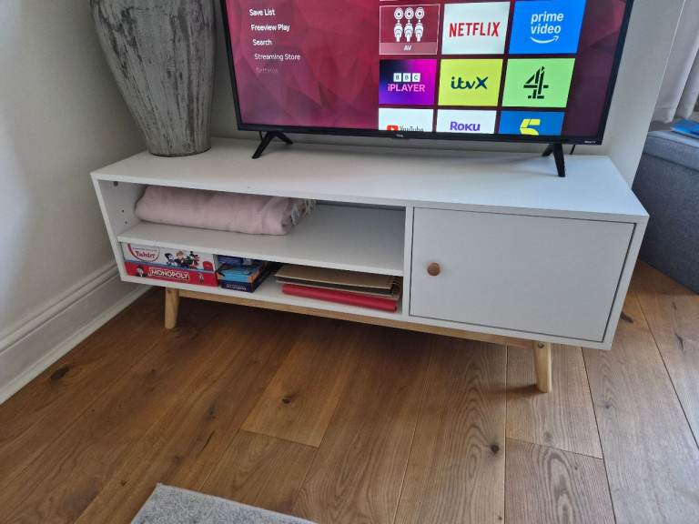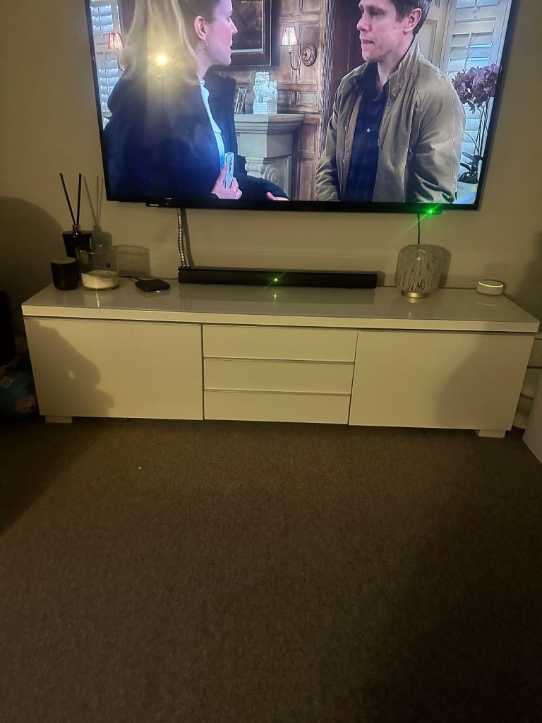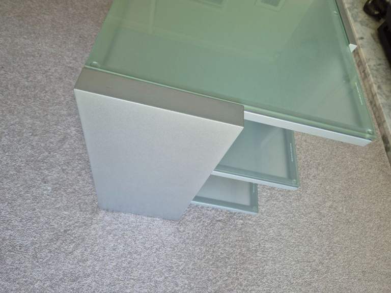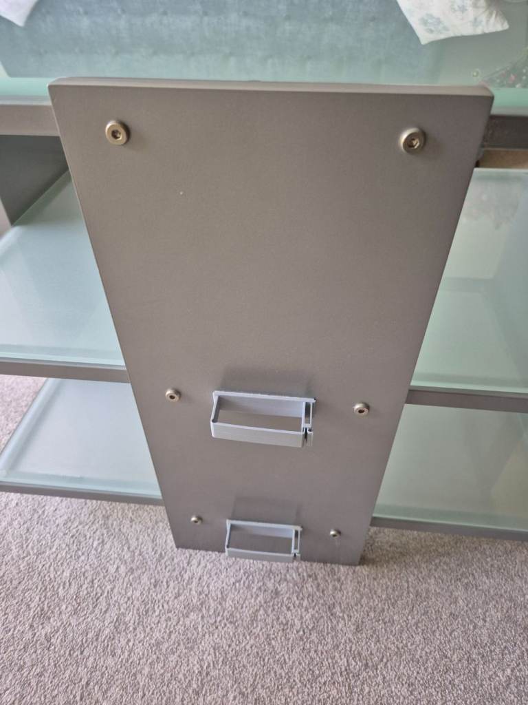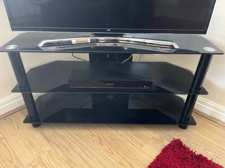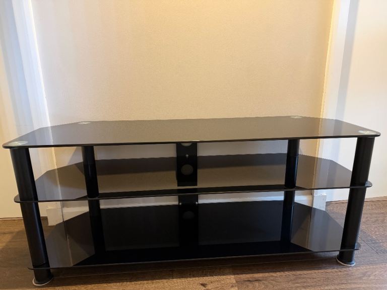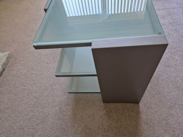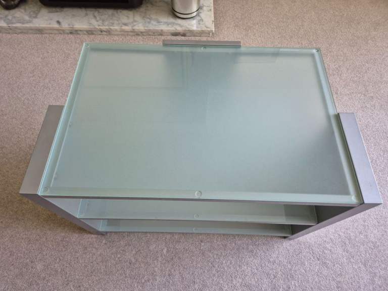 John Lewis frosted glass TV stand - approx dimensions are 67cm wide x 42cm deep x 46cm tall