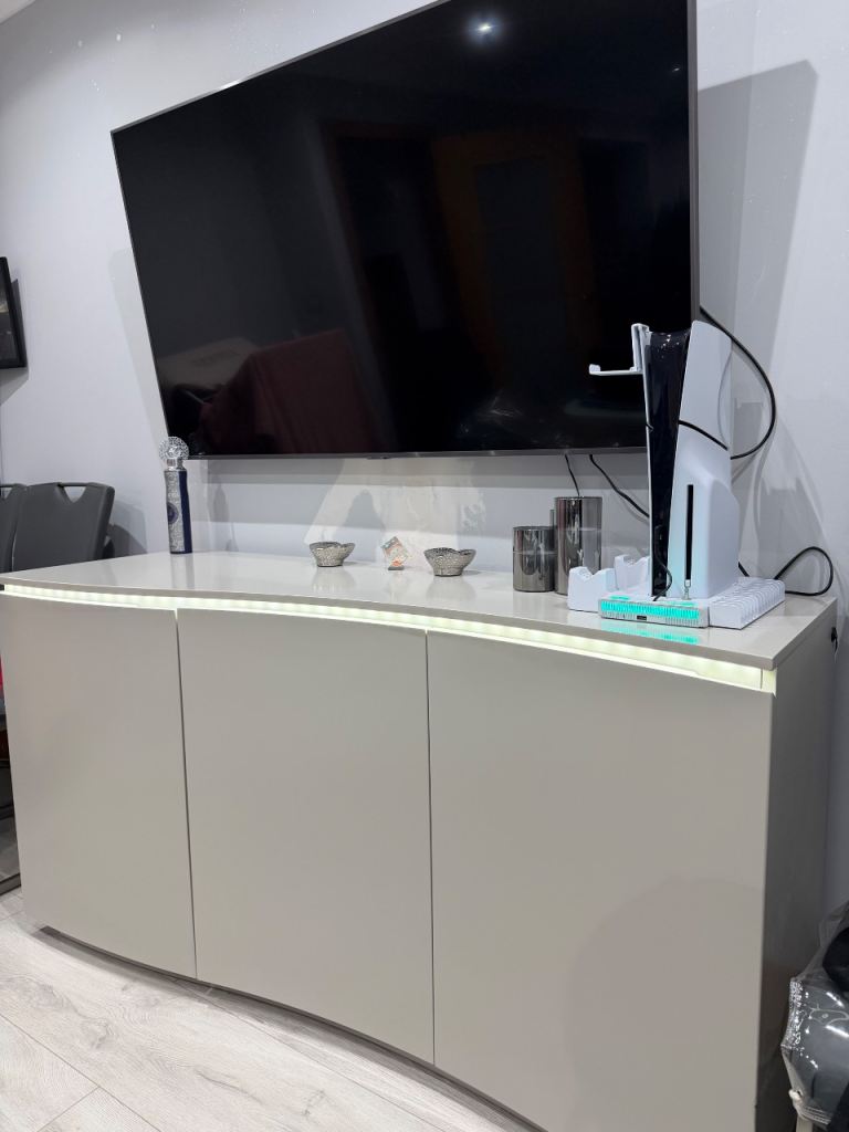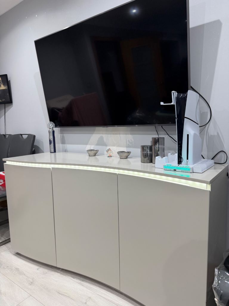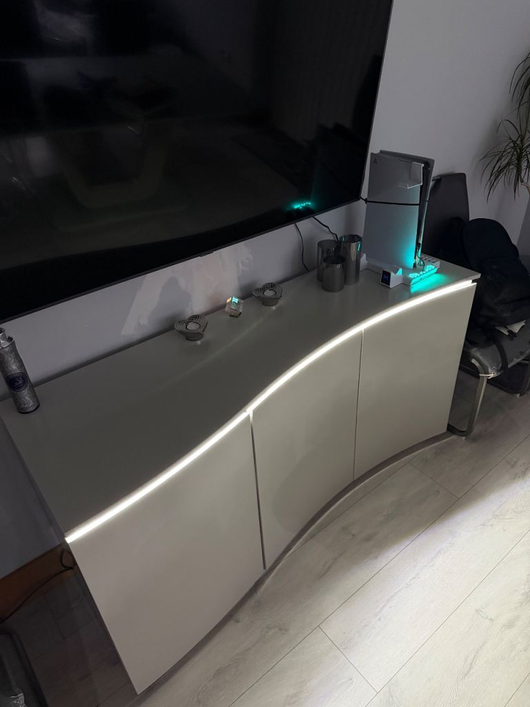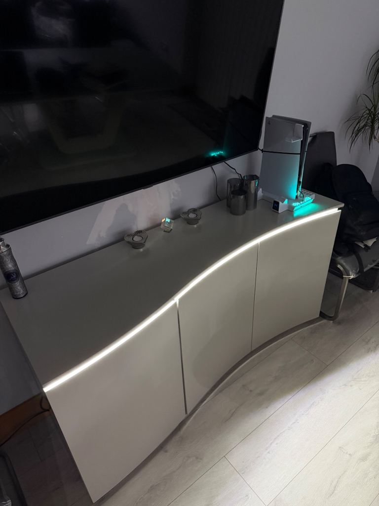 Stunning modern curved TV unit / sideboard in a high-gloss finish, featuring integrated LED lighting.