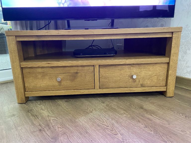 Next Barlow TV unit with two draws. Excellent condition m. Oak colour. Dimensions: 55cm deep, 112cm wide, 48cm high. (Bookcase and sideboard also for sale separately)