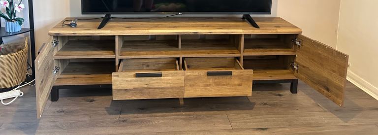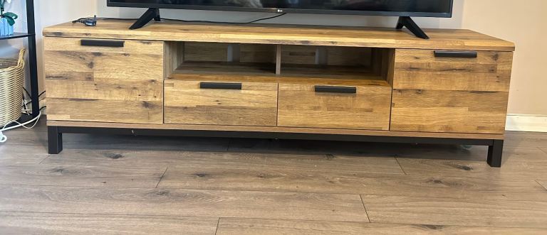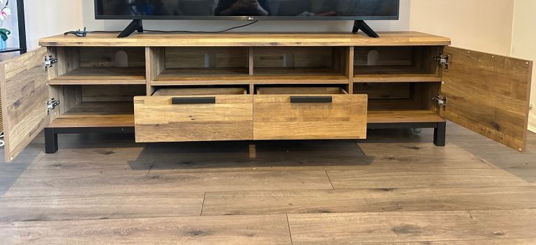 Large tv unit in very good condition. Does have two imperfections which are pictured. Measurements are also pictured