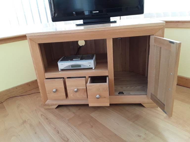This corner TV stand is from the 'Bevel' range Oak Furnitureland. It is on sale at the moment for £379 down from £459. It is 64cms tall, 93cms wide, 55cms deep. Full dimensions can be found on Oak Furnitureland website.