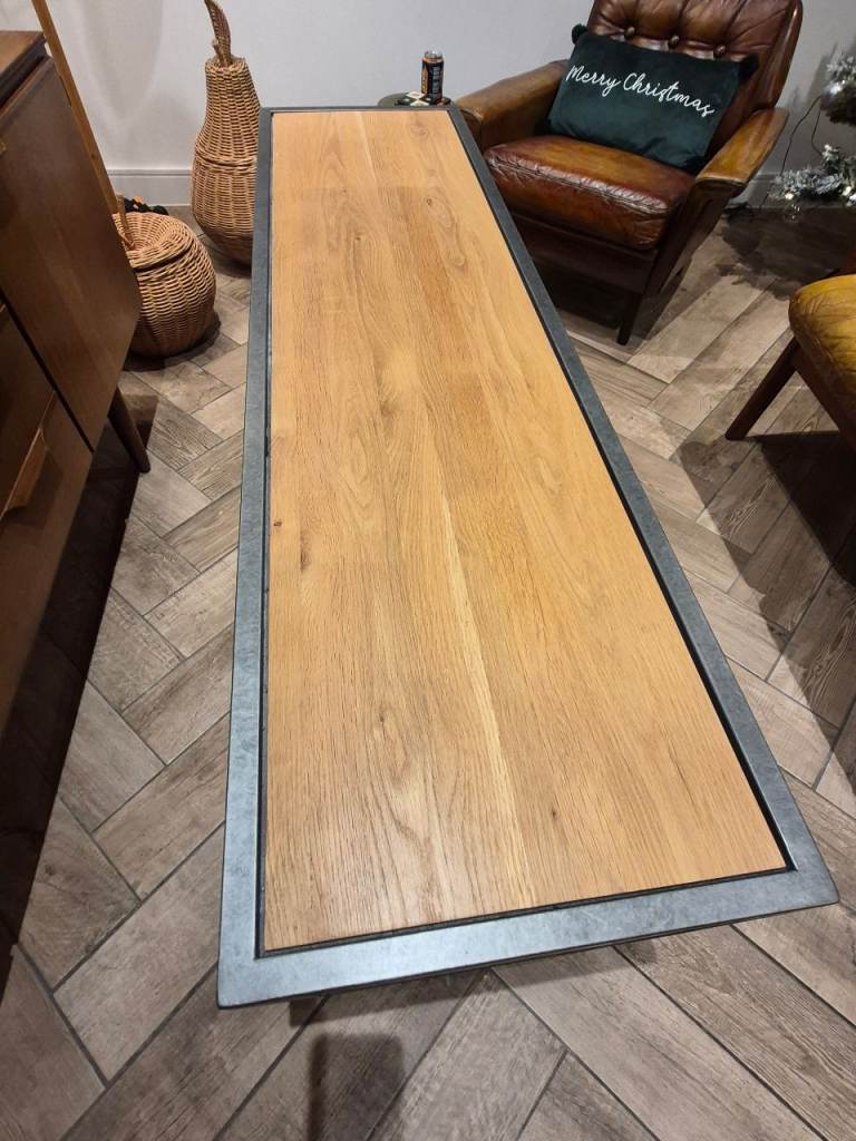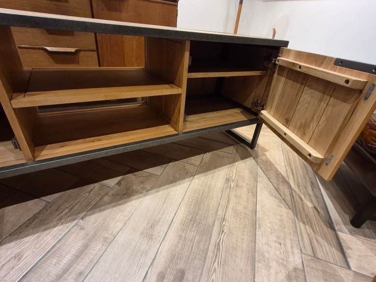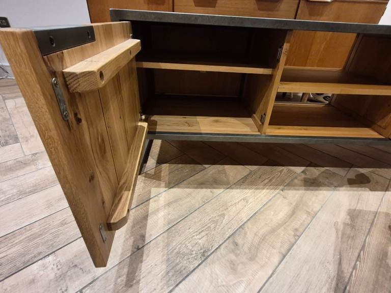 UPLIFT ONLY. Metal framed oak cabinet originally from Oak Furnitureland. Cupboard storage either side of central open shelving for DVD players, consoles etc.