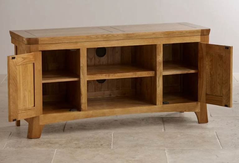 The Orrick Rustic Solid Oak Large TV Cabinet is designed to effortlessly accommodate your widescreen television, media players, and other appliances, whilst offering supplementary storage for any DVDs, games or accessories that go with them.