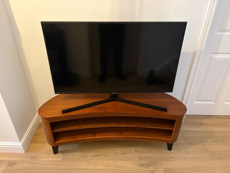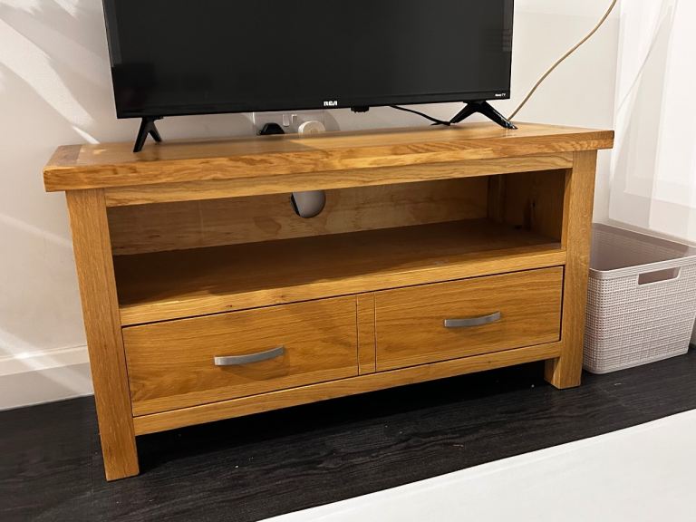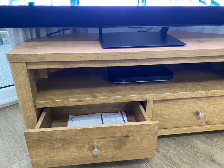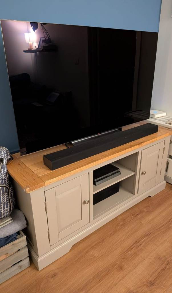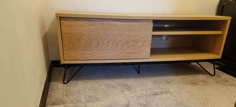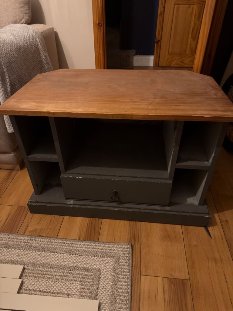 Small TV stand. Glass doors. Shelf inside. Baige in colour.