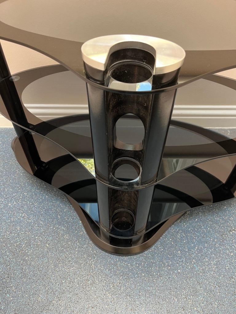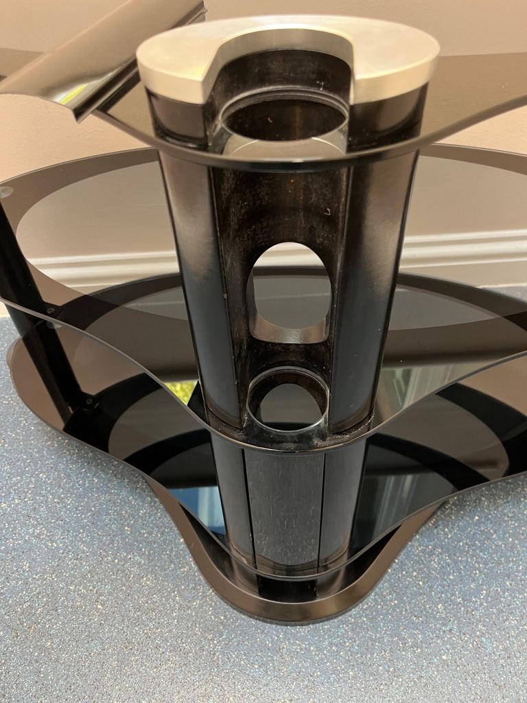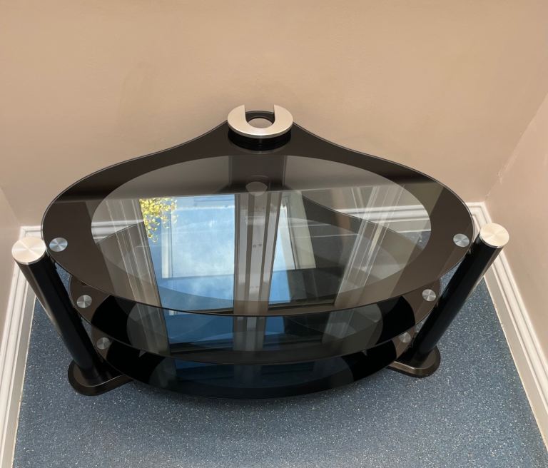 Used in Excellent Condition a 3 tier Smoked toughen Glass TV Stand colour black with Crome ends. Oval shaped. Size 34 inches in length 20 inches in depth and 21.5 inches in height. Has a long slot at back for hiding your leads.