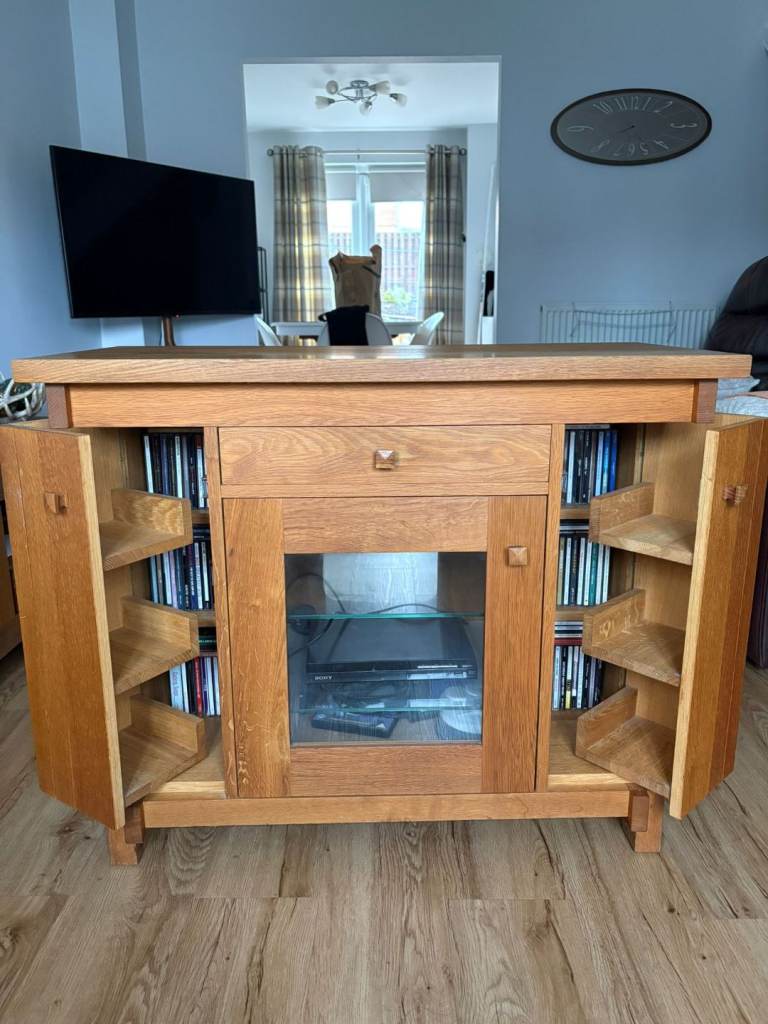 Heavy sid Oak TV stand with cupboards for CDs.