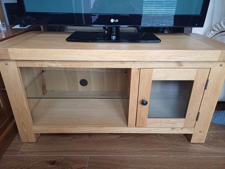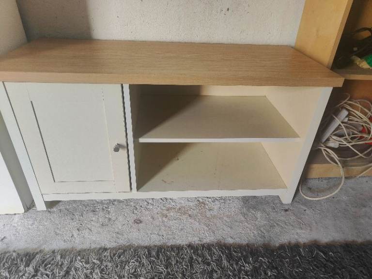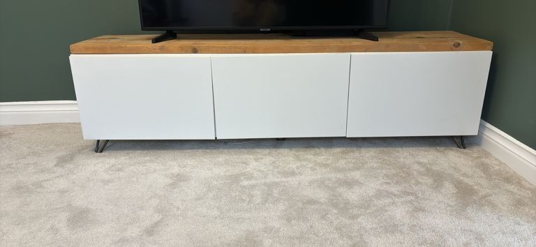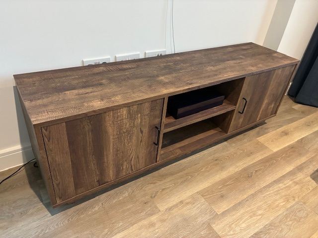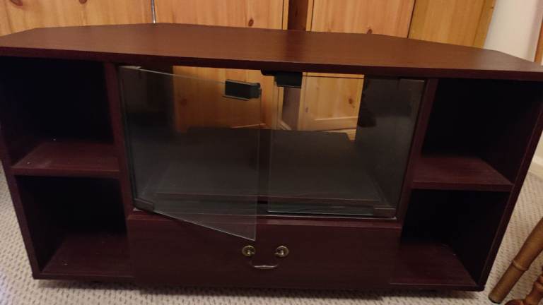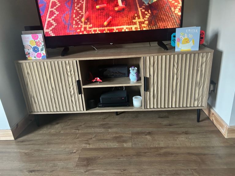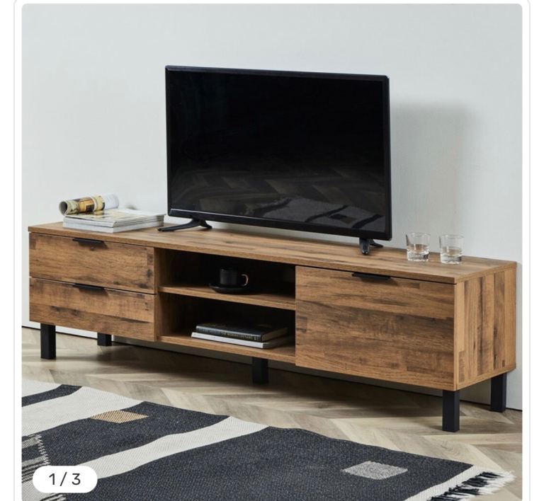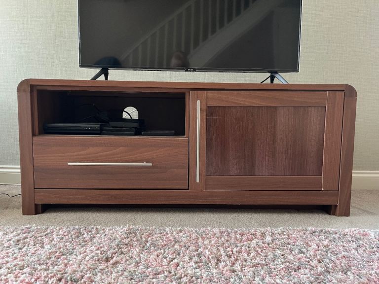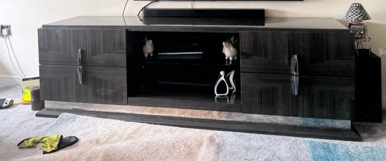 Features 4 drawers (2 each side) and a central shelf for media devices. Chrome handles and solid base.