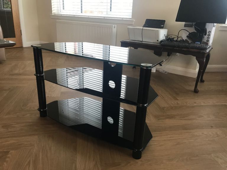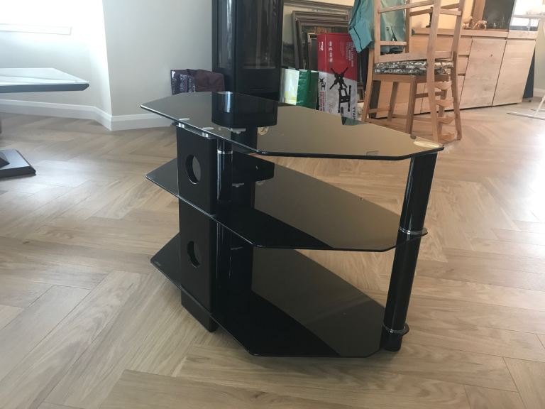 Glass stand with two shelves. In as new condition.Good for the corner of a room.Strong and robust.