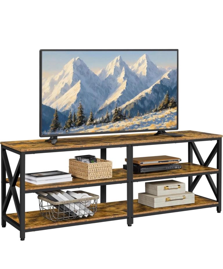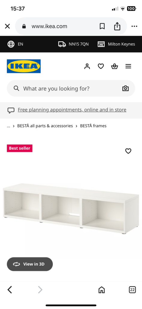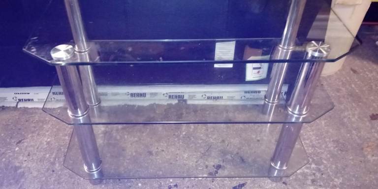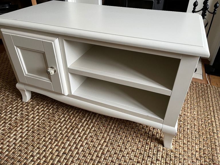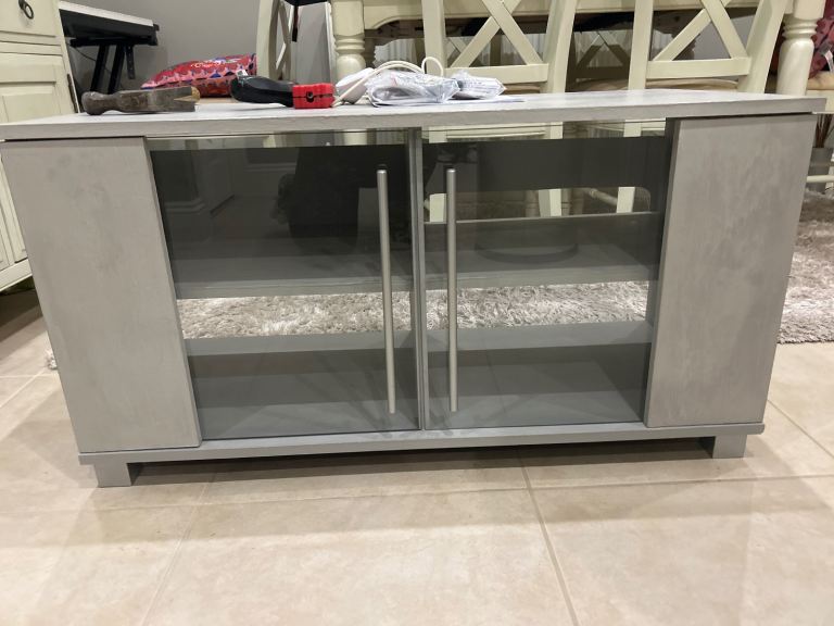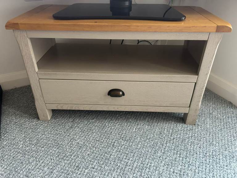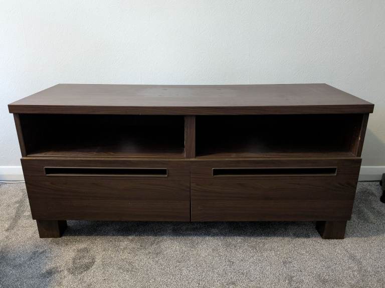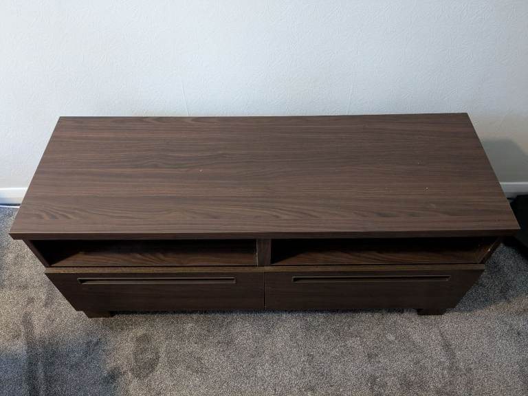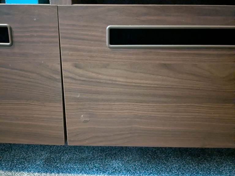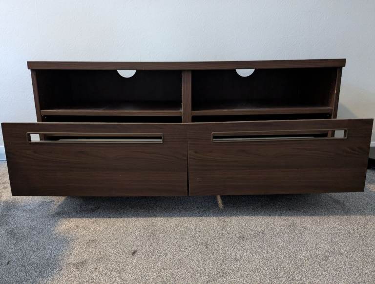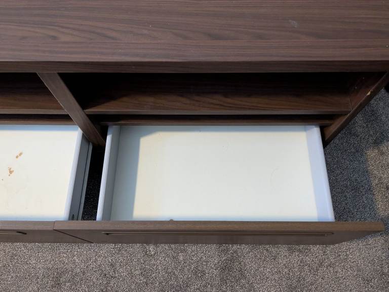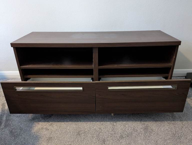 Very wide 2-drawer TV unit. Large shelves under the main surface and further narrow shelves behind the windows in the drawers for DVD player, TV box, etc.