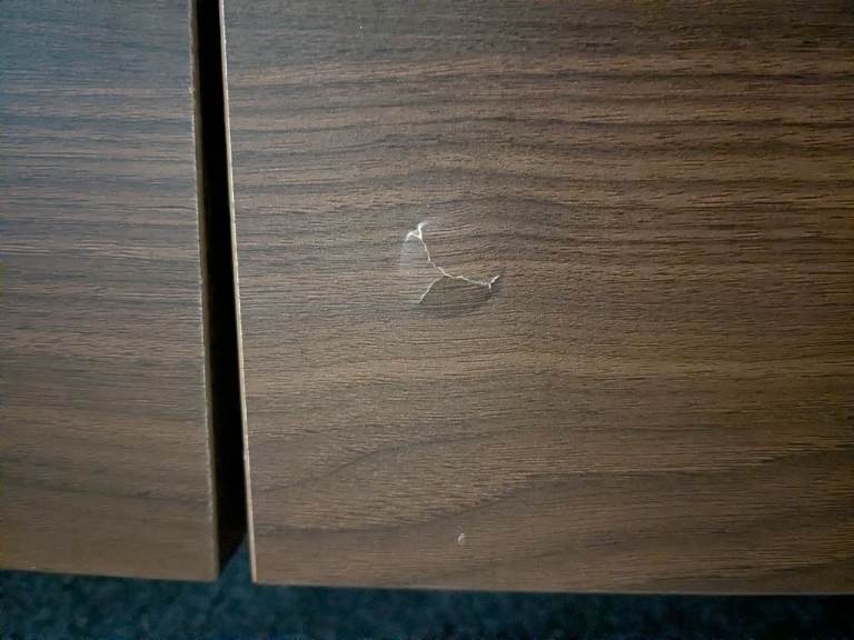 Some of the surfaces are a bit chipped and there is a tiny crack in the right drawer (see last picture). Lining in the left drawer has been damaged by a leaky battery.