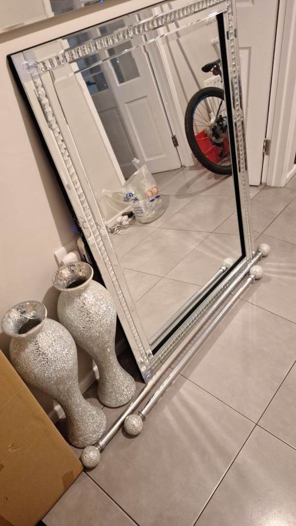 Tv unit, two vases, two curtain poles and large mirror. TV unit bottom drawer is cracked but can be fixed