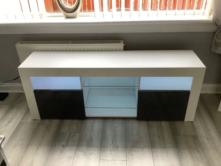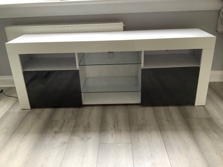 Grey and white gloss Tv unit with lights length 145cm x53cm width 35 cm fits up to a 65in Tv very good condition