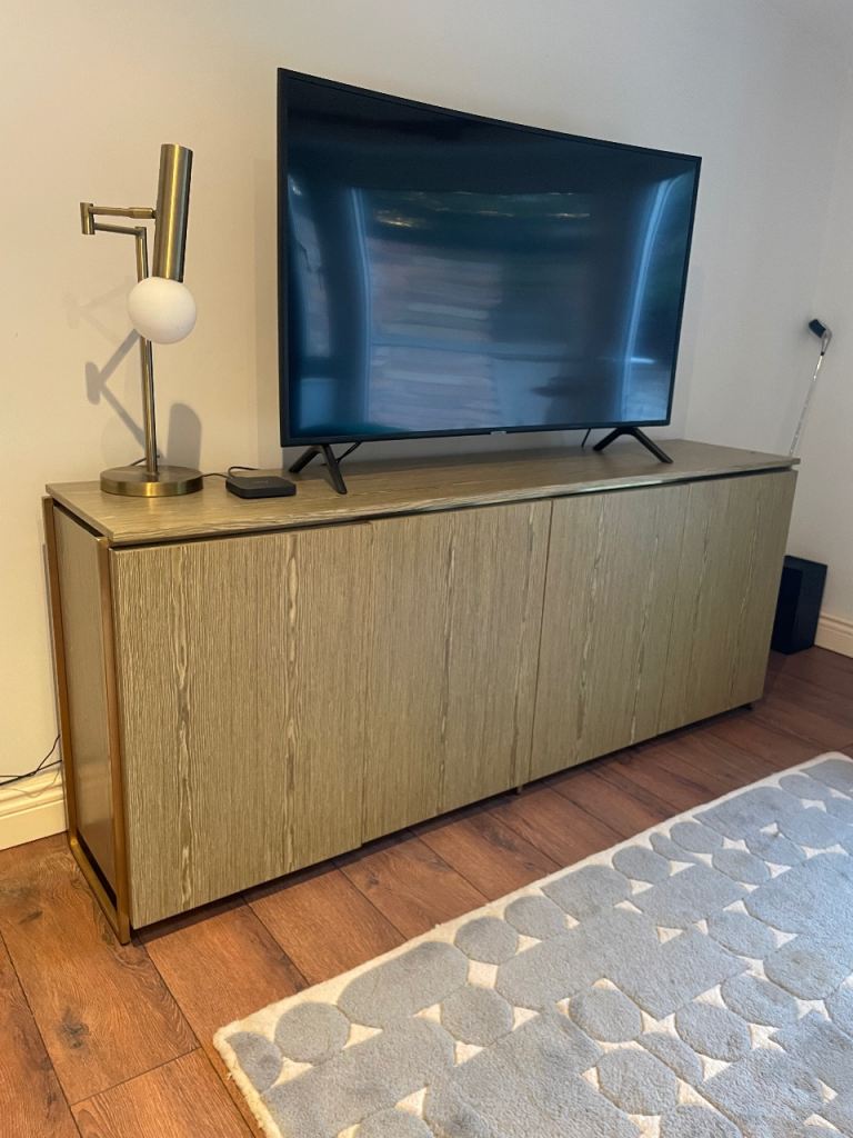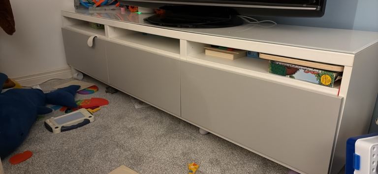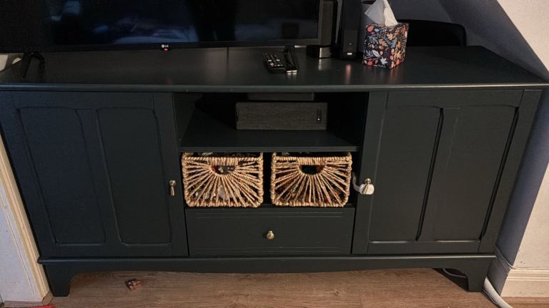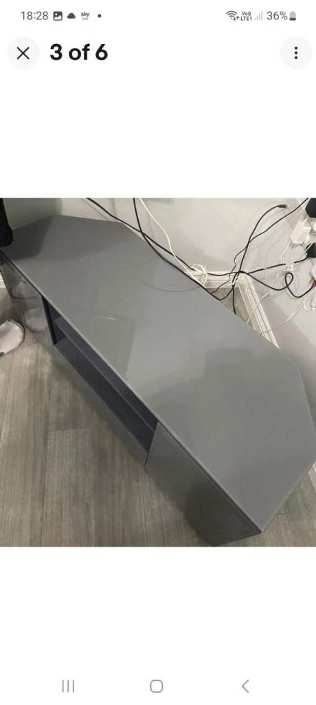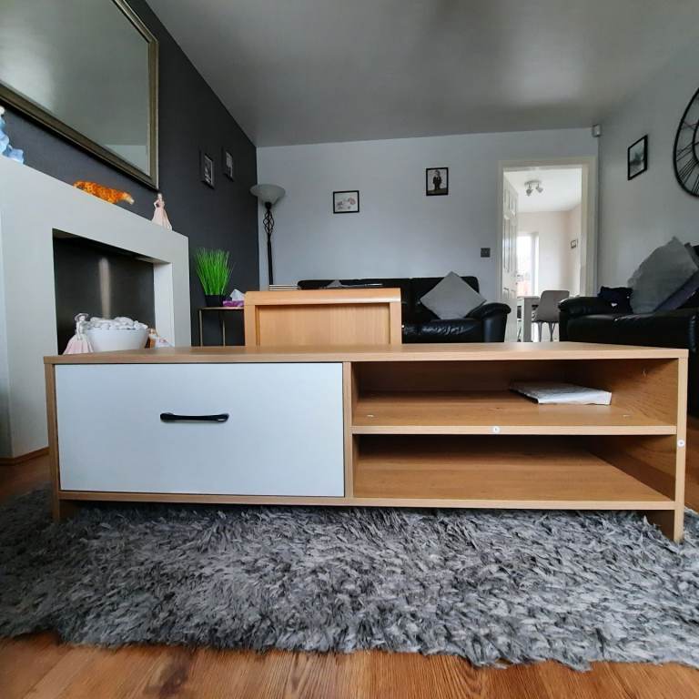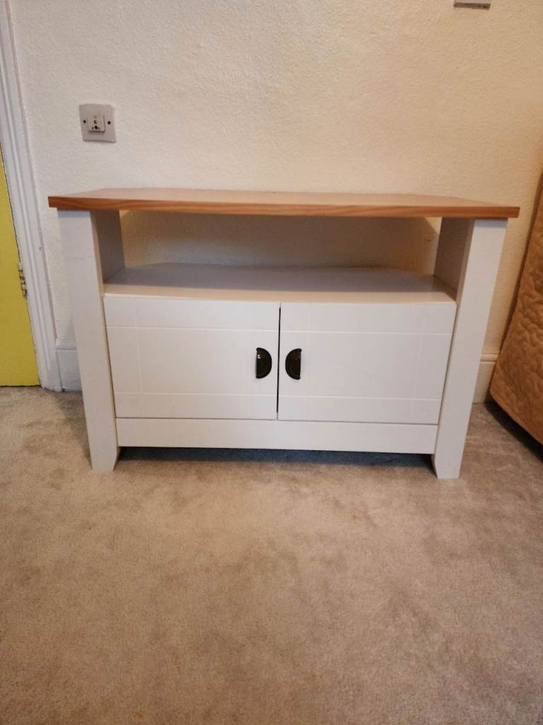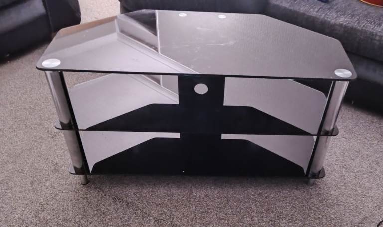 Assembled Wooden TV stand with little compartments for individual devices to be put in. Which is in good condition