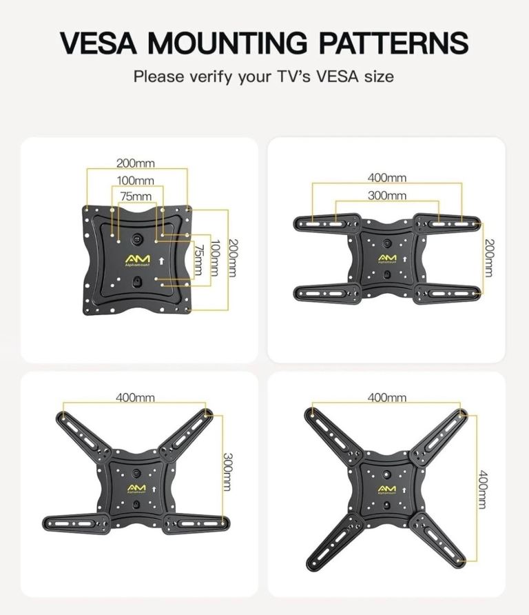 Universal Design - Alphamount TV wall mount is suitable for most Flat & Curved 26-60 inch TVs up to 35kg. Compatible with VESA (mounting holes) 75x75/100X100/200x100/200x200/300x200/300x300/400x200/400x300/400x400mm.