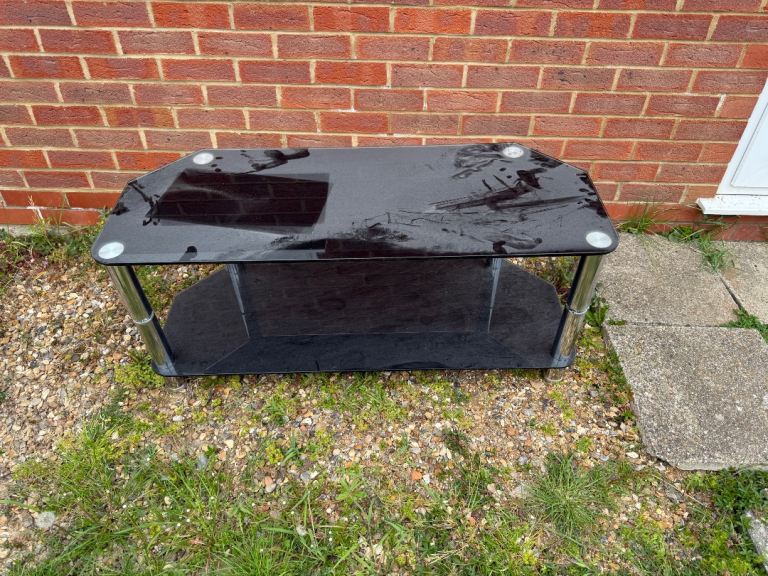 Black glass tv stand with chrome pillars, middle shelf shattered leaving only the top and bottom shelf otherwise pristine, needs a wipe.