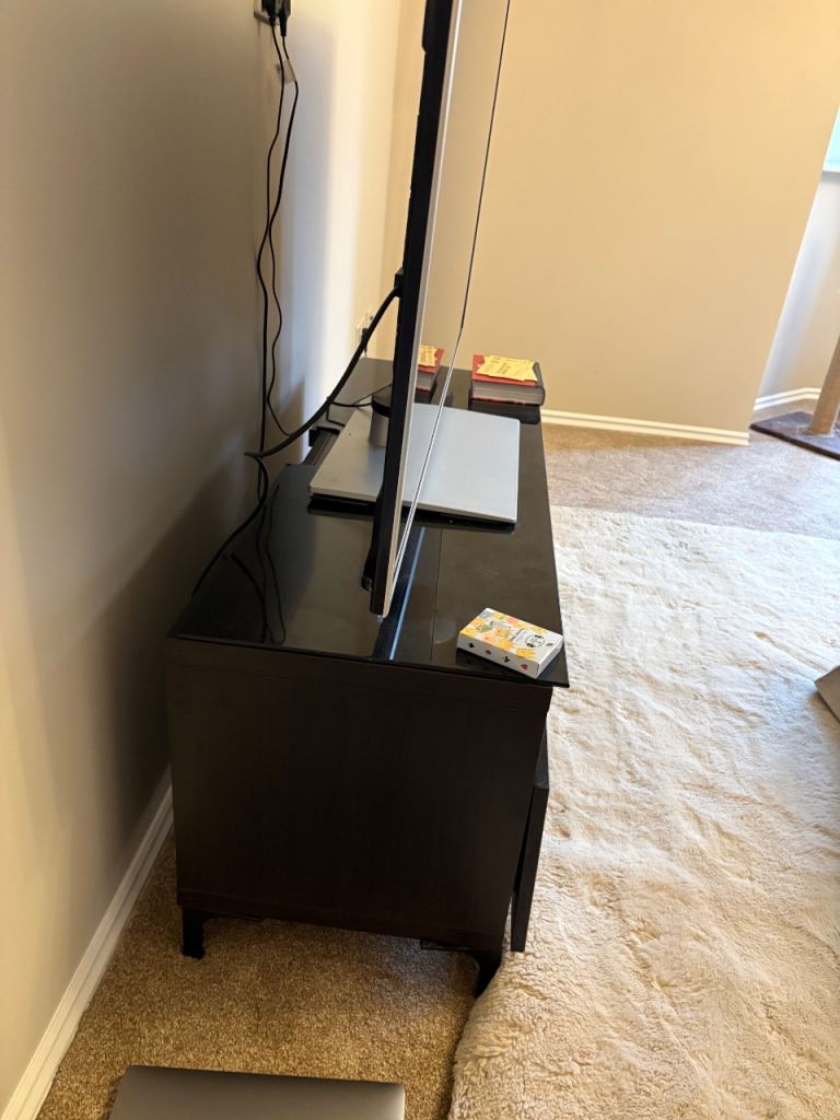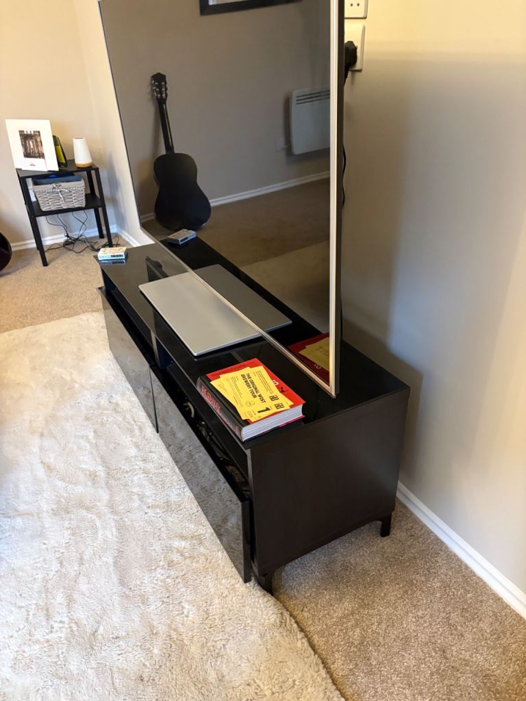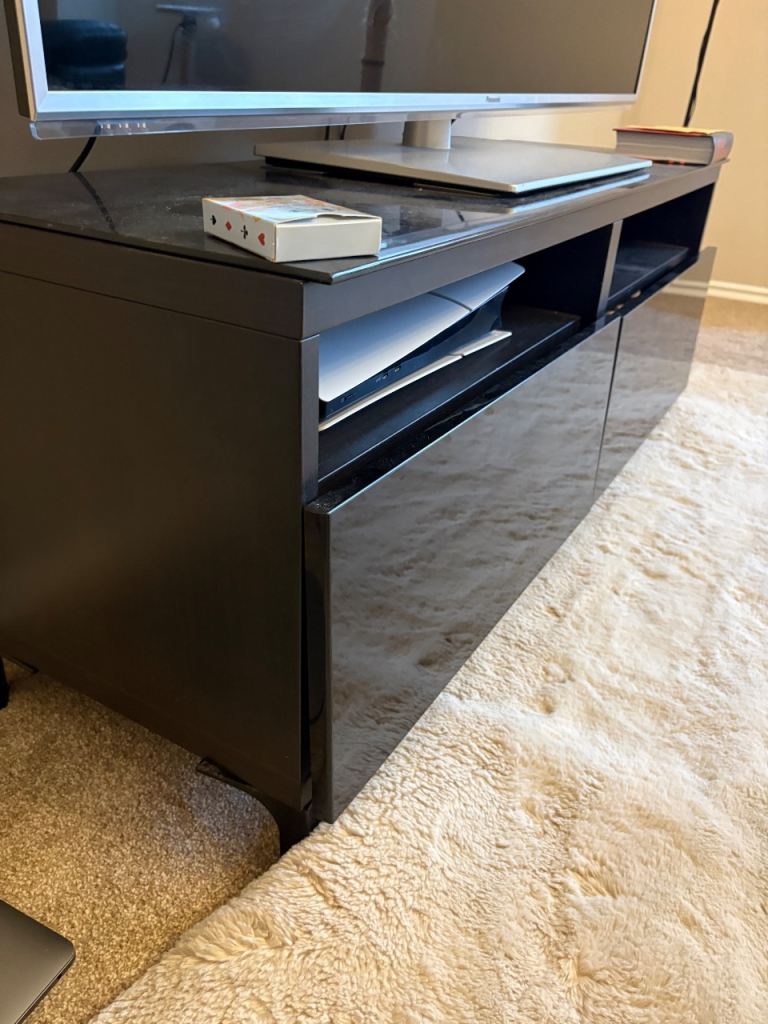Black tv stand. 2 drawers. Drawers a bit temperamental but other than that it’s in great condition.
