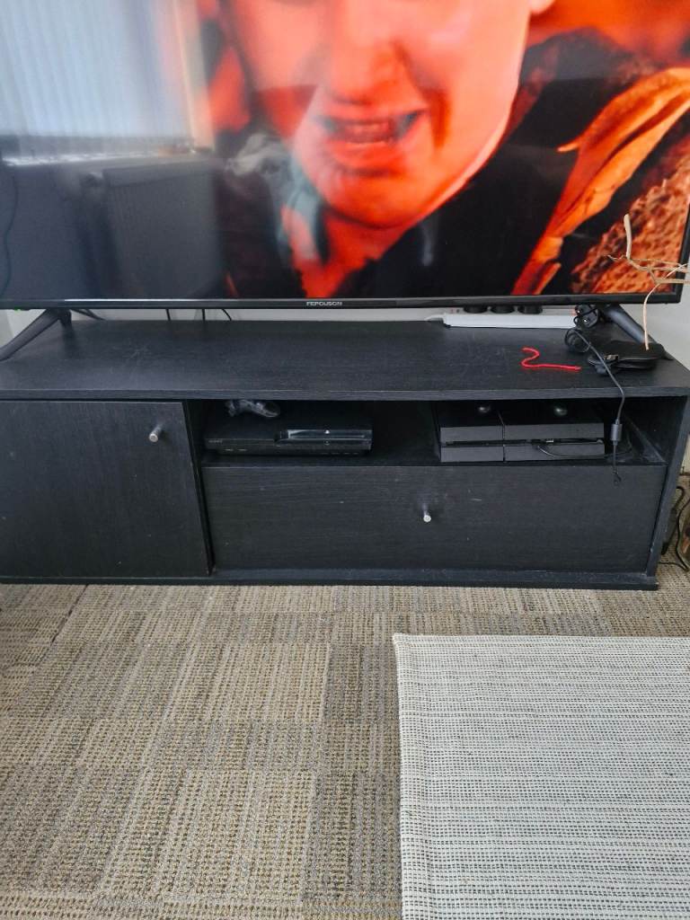 Black tv stand holds 55 inch no problems plenty of storage draw and cupboard bought new one comes from pet free and smoke free home collection only cash on collection