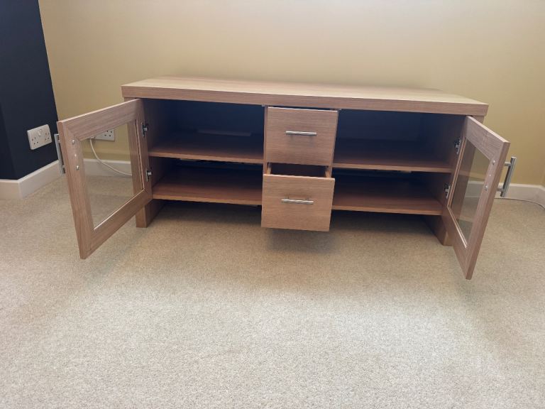 The Contemporary Oak Effect TV and Media Stand Cabinet Unit is a stylish and modern piece of furniture for the living room. With an oak effect finish this rectangular TV stand has a matte finish and a medium wood tone. With two doors and a hinge mechanism, it offers plenty of storage space for your media. The freestanding design makes it easy to place in any room. Ideal for adults looking to enhance their home entertainment setup with a contemporary touch.