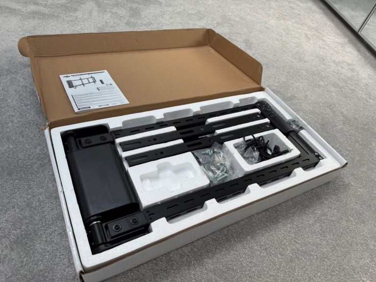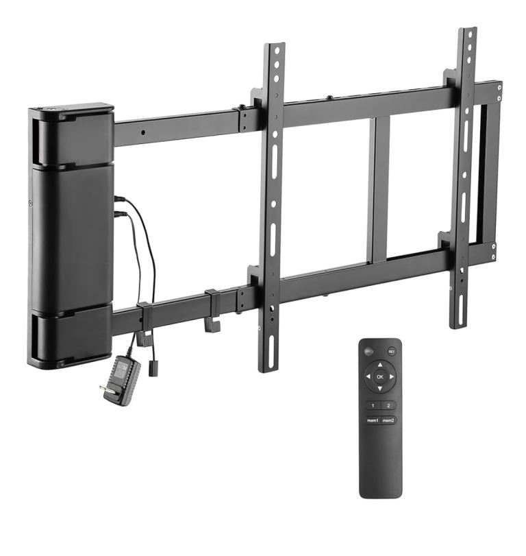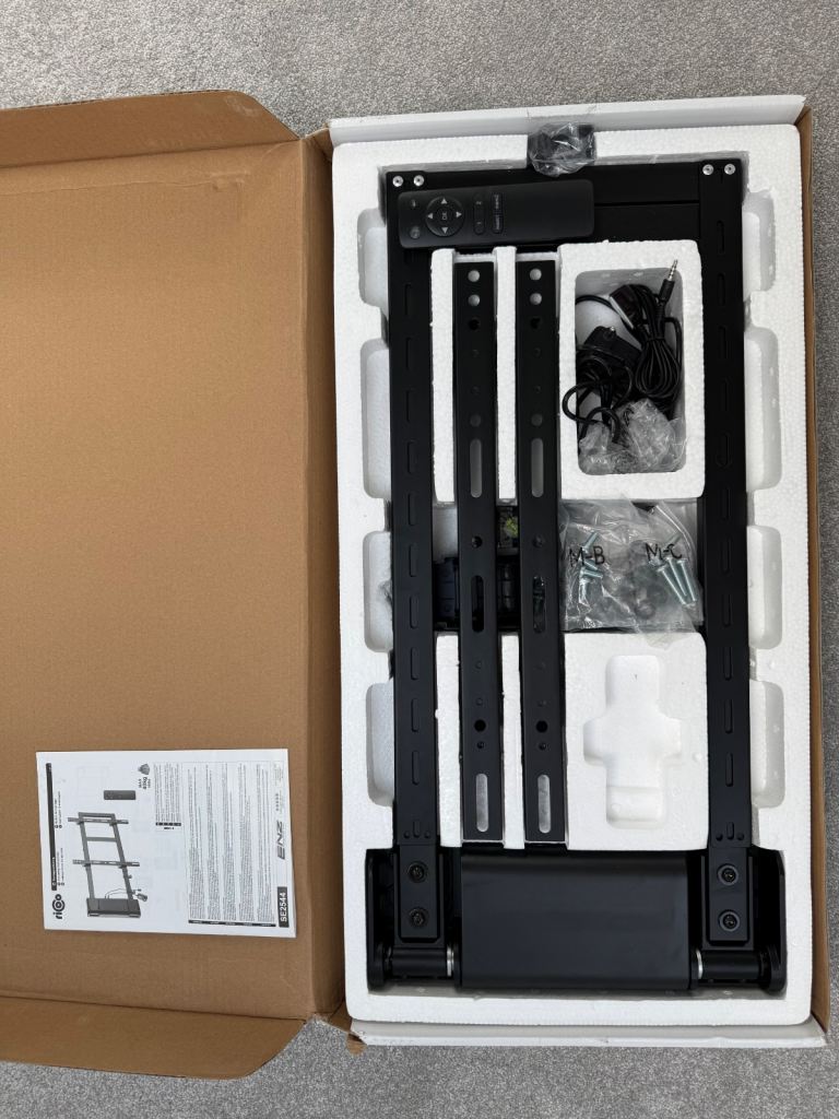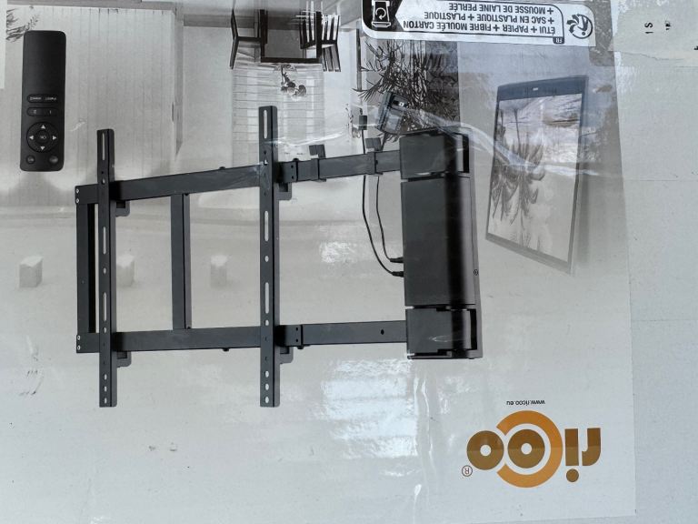 Ultra modern electric, slim lined, TV bracket. Full motion, allows TV to move from flat against the wall, to a 90° angle. Brand-new, inbox, not used. Can hold a TV up to 47 inches. With remote control. (The equivalent is currently for sale for £230 on Amazon)! Grave yourself a luxurious bargain!