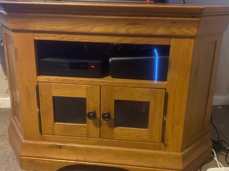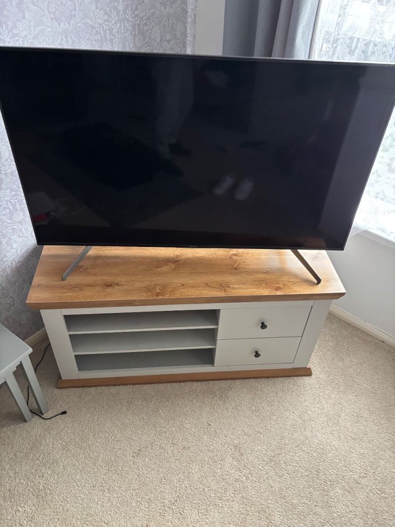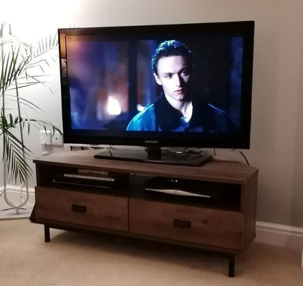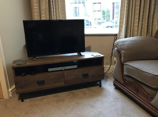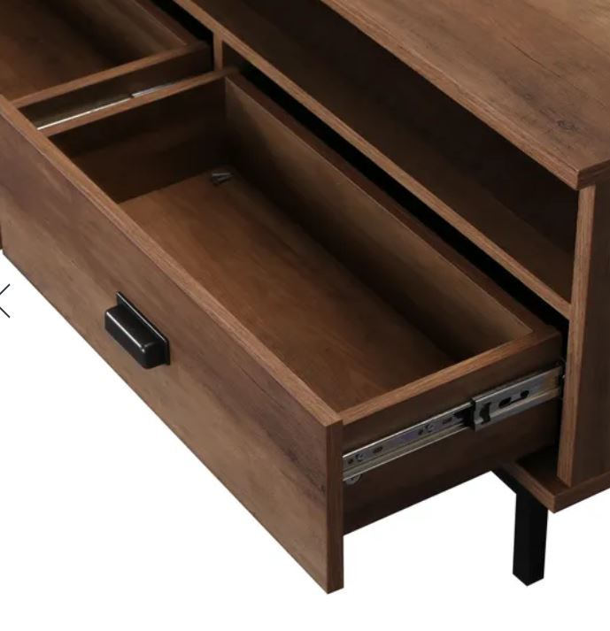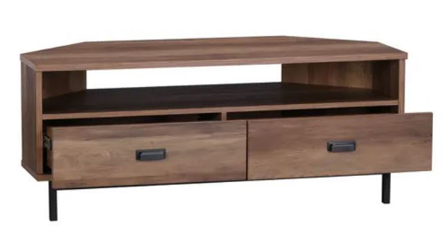 Featuring a solid edge finish, this elegant TV stand is crafted with two ample-sized drawers complete with smooth metal extension runners and pull-out stop. Designed as a corner stand, this space saving unit features an open shelf with cable access and sturdy base.