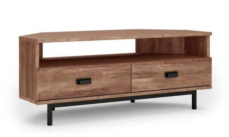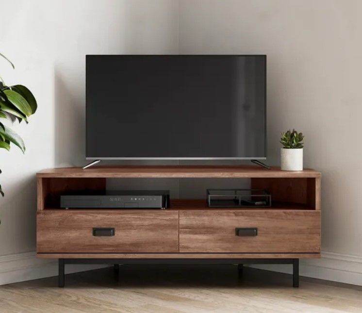 Featuring a solid edge finish, this elegant TV stand is crafted with two ample-sized drawers complete with smooth metal extension runners and pull-out stop. Designed as a corner stand, this space saving unit features an open shelf with cable access and sturdy base.